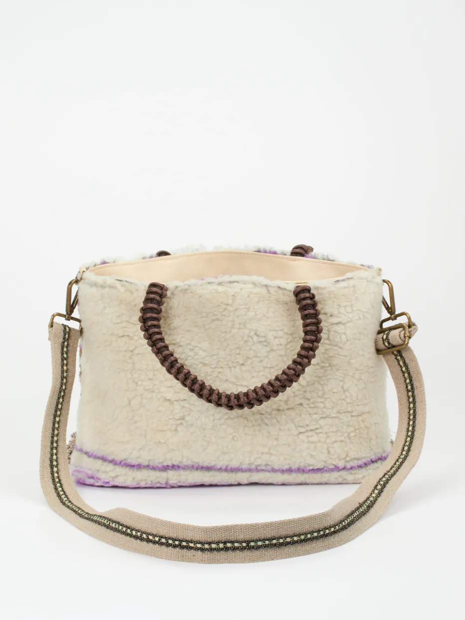 Ein echter Blickfänger ist diese kreative Tasche aus dem Hause Konstantin Starke. Das Teddyfell begeistert durch seinen unkonventionellen Farbmix in Offwhite, Violett und Braun. Die Kordeln am unteren Taschenbereich lassen ein Hauch von Boheme aufleben. Die gehäkelten, schokoladenbraunen Henkel werden von tonigem Flechtleder umwickelt. Das Innere wird durch ein farbenfrohes Blütenmuster belebt. Es enthält ausreichend Platz für all Ihre Essentials. Der bestickte Schulterriemen kann bei Bedarf abgenommen werden. Ein tolles Accessoire, das in Erinnerung bleibt! – Material: Textil – Farbe: Multi – Maße: ca. 25 x 38 x 13 ( H x B x T) – Innen: zwei Reißverschlussfächer – Schulterriemen: ca. 90 cm, abnehmbar, verstellbar