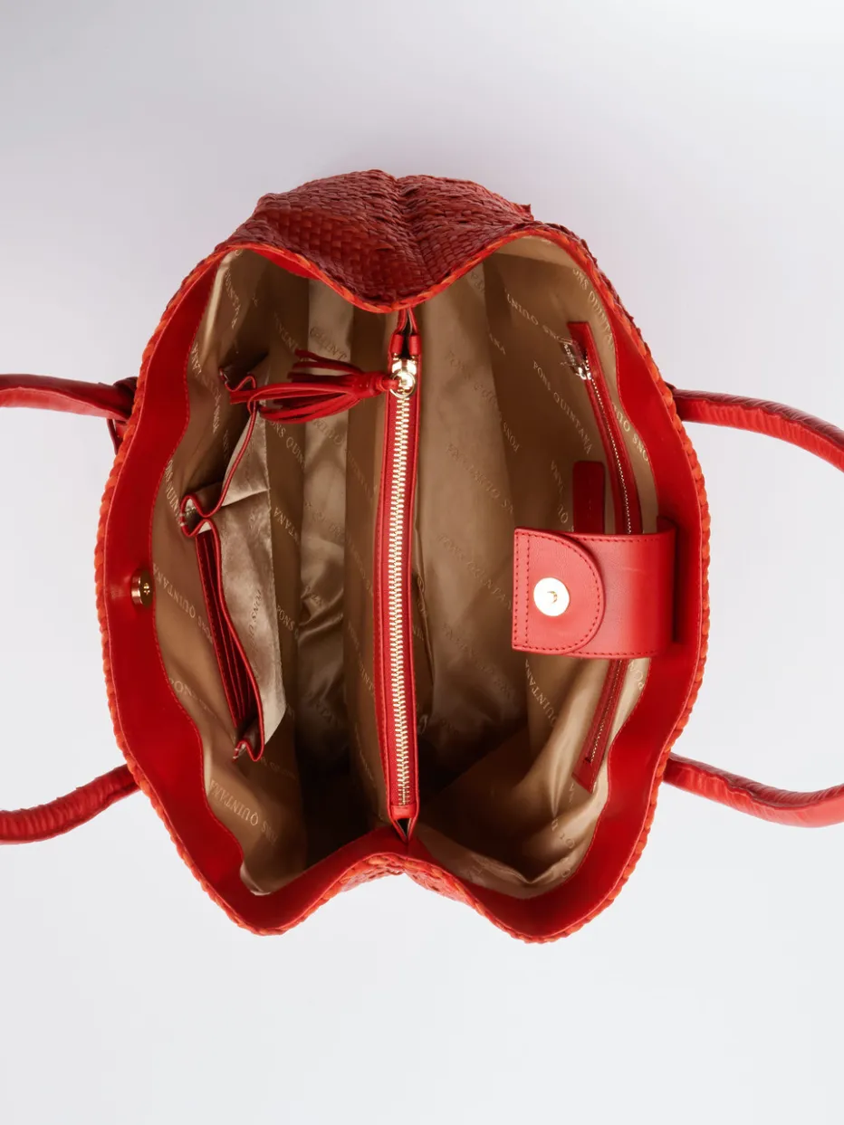 Dieser in Tomatenrot gefärbte Flechtleder-Shopper verbindet mediterranen Charme mit funktionaler Raffinesse – ein markanter Begleiter für stilbewusste Tageslooks.