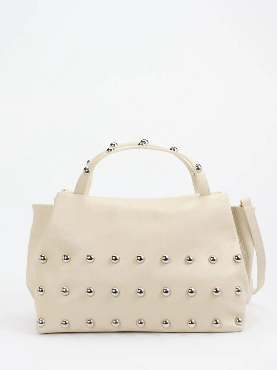 Ein echter Hingucker ist diese modische Umhängetasche des italienischen Labels Marlon Firenze. Das beige Kalbleder bekommt durch die natürliche Narbung eine feine Struktur. Große silberfarbene Nieten sehen toll aus und verleihen ein urbanes Lebensgefühl. Der geräumige Innenraum bietet viel Platz. Der tonige Schulterriemen kann auf Wunsch abgenommen werden. Ein selbstbewusstes Accessoire, das Ihrem Outfit einen raffinierten Touch verleiht! – Material: Kalbleder – Farbe: Beige – Größe: 26 x 36 x 22 cm (H x B x T) – Schulterriemen: ca. 115 cm, abnehm- und verstellbar – Verschluss: Reißverschluss – Innen: ein Reißverschlussfach