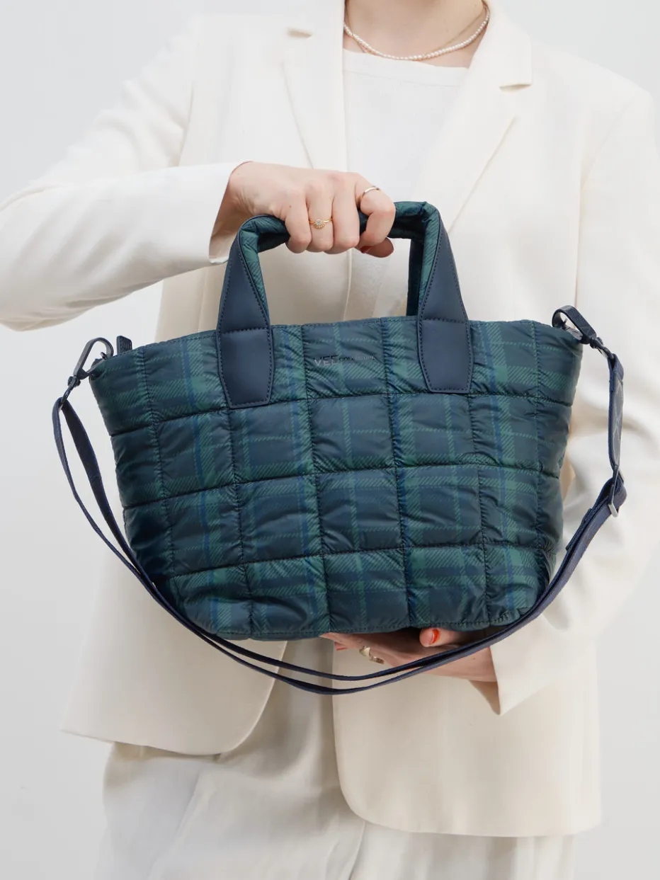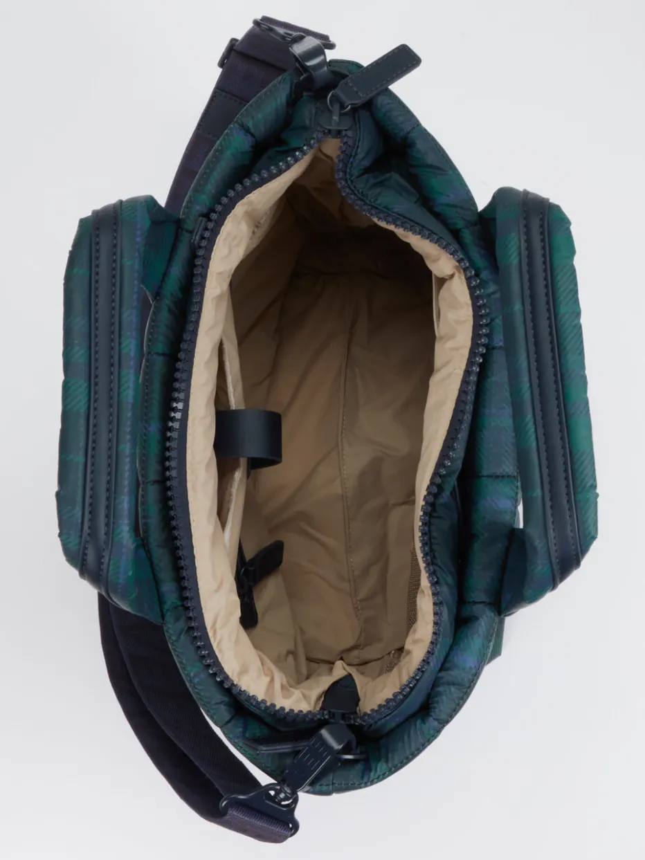 Der gesteppte Shopper aus Nylon kombiniert ein modernes Tartan-Muster mit praktischen Details und überzeugt durch stilvolle Funktionalität für den urbanen Alltag.