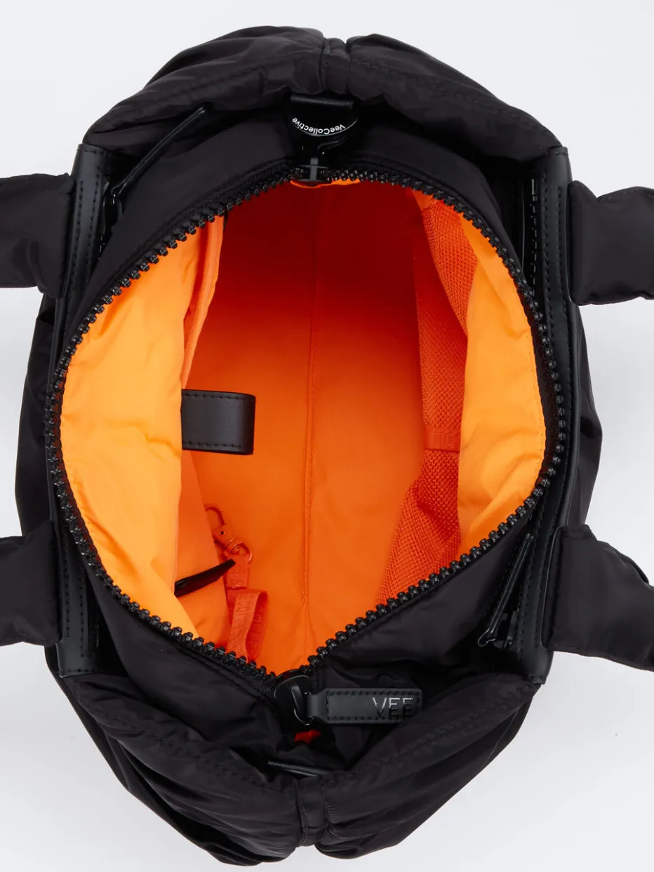 Dieser modische Shopper kommt von der Marke Vee Collective Berlin. Das schwarze, recycelte Nylonmaterial zeigt sich matt glänzend und wird am oberen Rand unter dem tonigen Kunstleder-Element sowie an der Unterseite feminin gerafft. Hier zeigt sich unverkennbar der Markenname. Die weichen Riemen sowie der geräumige, orangefarbene Innenraum mit den beiden Seitentaschen und vielen Fächer versprechen angenehmen Komfort und ausreichend Platz. Mit dem längeren Gurt können Sie die Tasche auch bequem über der Schulter tragen. Der ideale Begleiter für den Tag im Büro oder einen Stadtbummel! – Obermaterial: 100% recyceltes Nylon – Futter: 100% recyceltes Polyester – Farbe: Schwarz – Größe: ca. 30 x 40 x 15 cm (H x B x T) – Schulterriemen: max. ca. 100 cm, abnehm-und verstellbar – Henkel: ca. 50 cm – Verschluss: Reißverschluss – Innen: ein Reißverschlussfach, drei Steckfächer – Außen: zwei Reißverschlussfächer – Extras: eine kleine Tasche