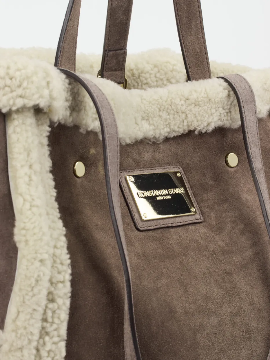 Ein Lieblingsstück für winterliche Begleiter. Konstantin Starke präsentiert einen Damen-Shopper, der Form und Funktion geschmackvoll vereint. Der stilvolle Alltagsbegleiter überzeugt mit seinem weichen, angerauten Textilmaterial in einem warmen Taupe-Ton. Die rechteckige Form bietet ein besonders großes Fassungsvermögen – perfekt für entspannte Wintertage in der Stadt oder auf Reisen. Akzente wie goldfarbene Hardware und ein sichtbarer Kunstfellbesatz unterstreichen den modischen Teddy-Trend. Der Magnetverschluss und ein Innenfach mit Reißverschluss sorgen für komfortable Handhabung. Ideal zu Strick, flauschigen Mänteln oder gefütterten Boots. Ein hochwertiger Taschendesign mit entspannter Lässigkeit im Sinne von Quiet Luxury.
