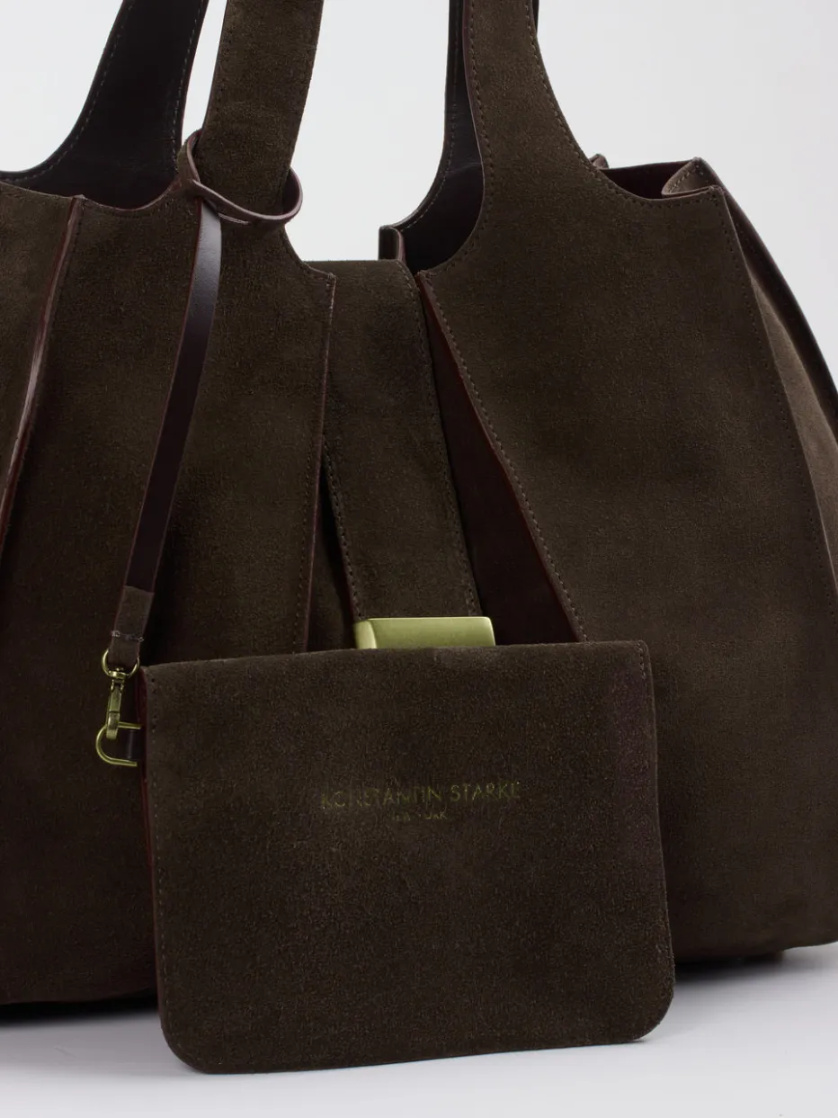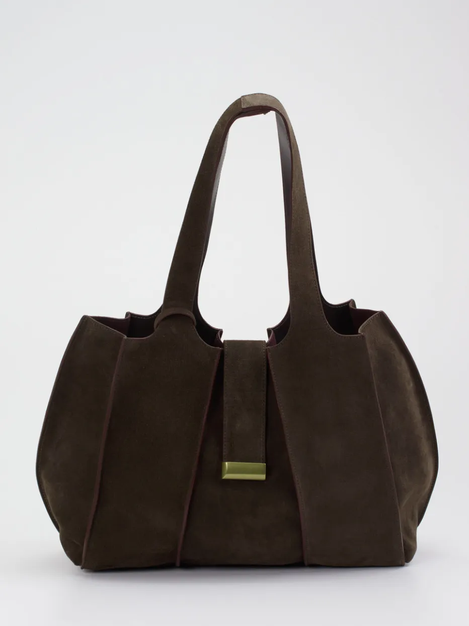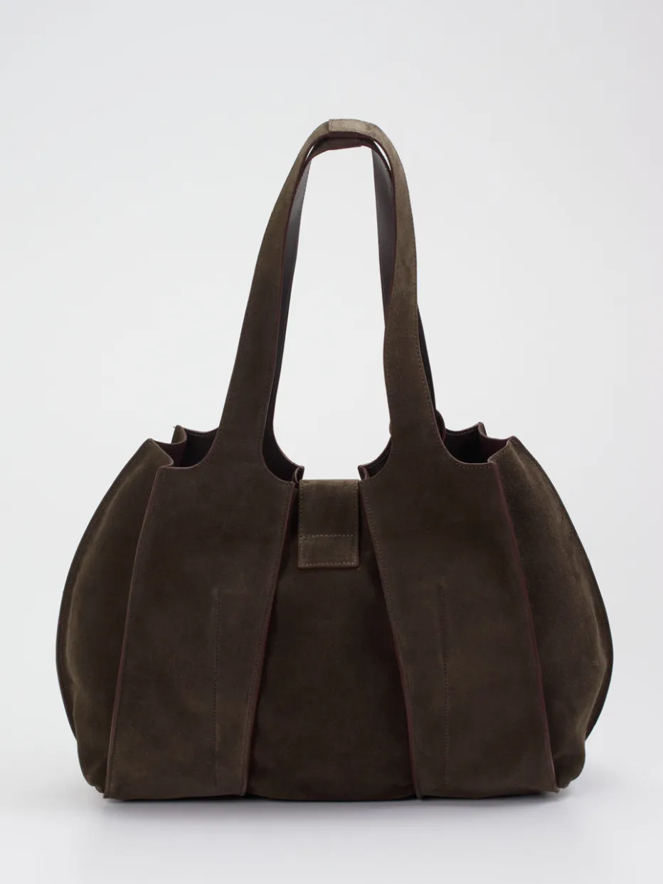 Hochwertiges Veloursleder trifft auf eine reduzierte Oversized-Form – diese Tasche verkörpert ein stilvolles Understatement mit funktionalen Details für Büro und Freizeit.