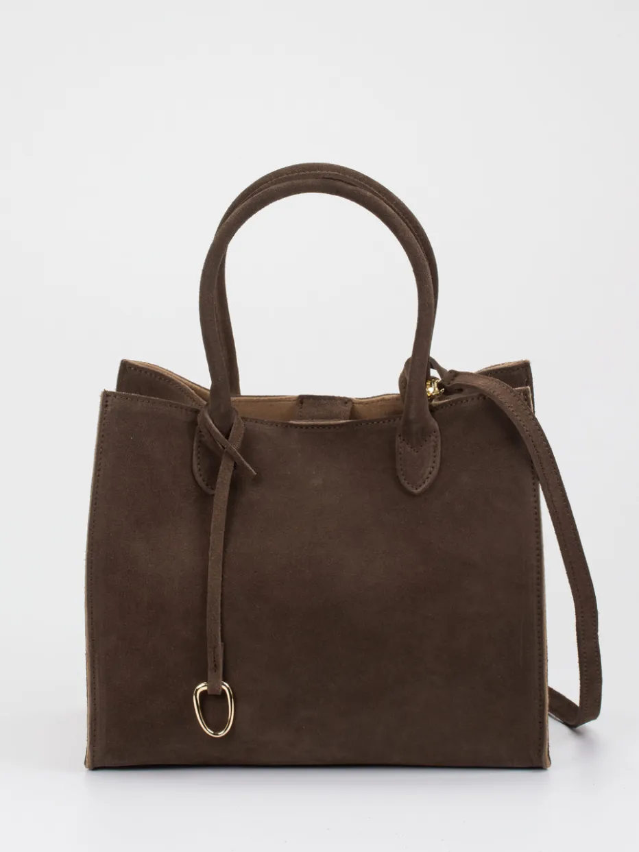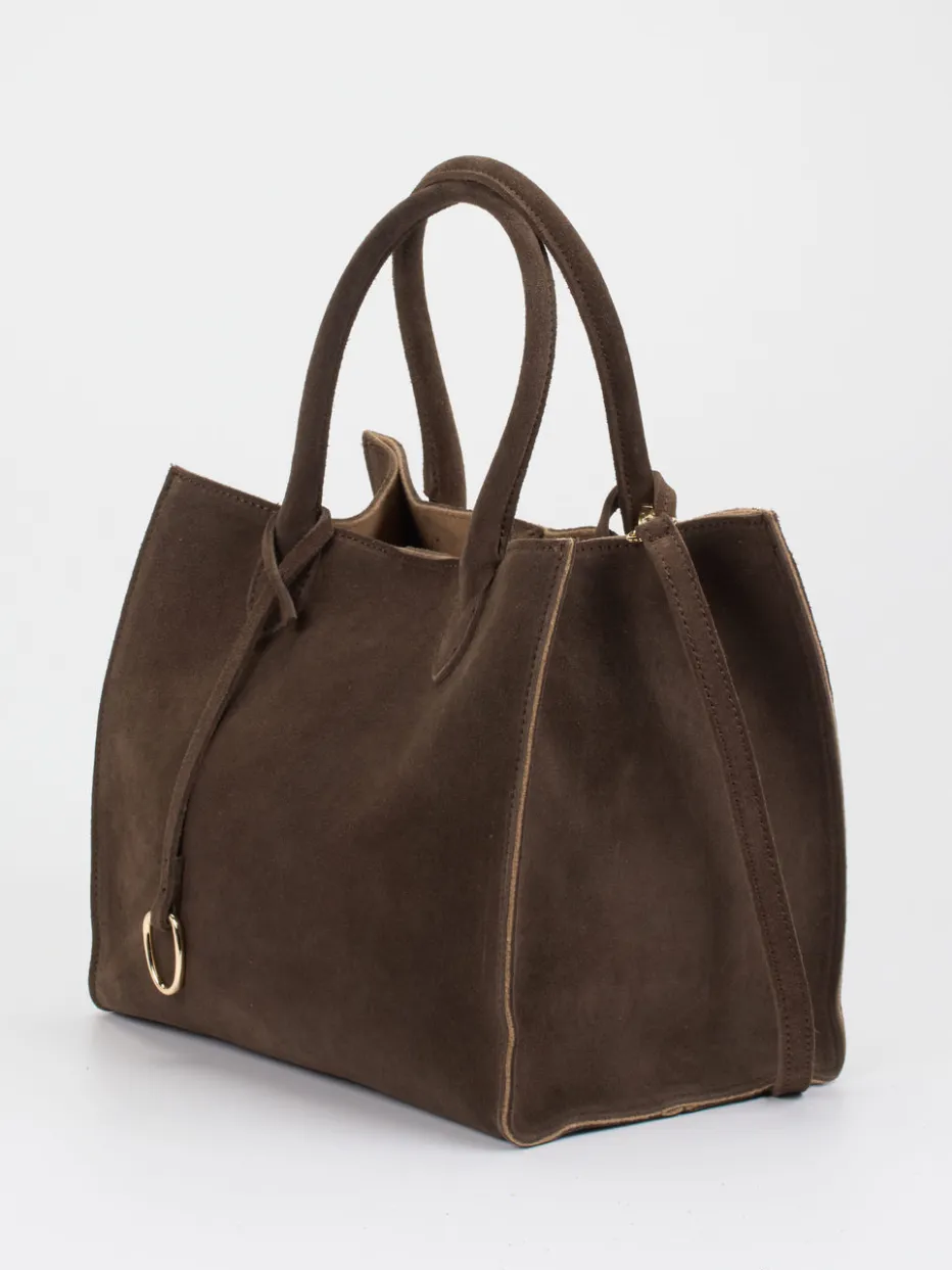 Dieser elegante Shopper überzeugt mit weich aufgerautem Veloursleder, strukturierter Silhouette und goldfarbenen Akzenten – ideal für Office und City-Style.