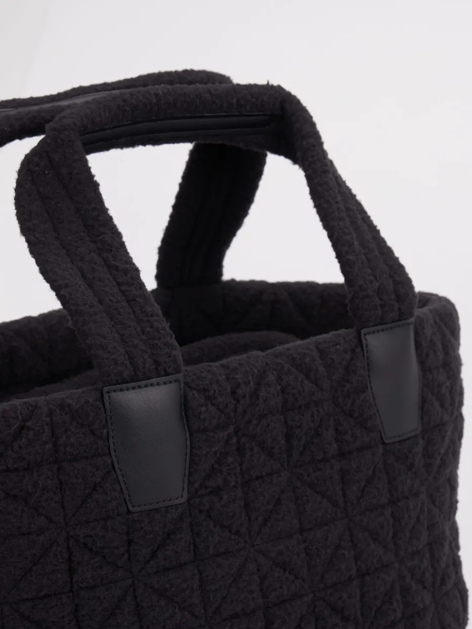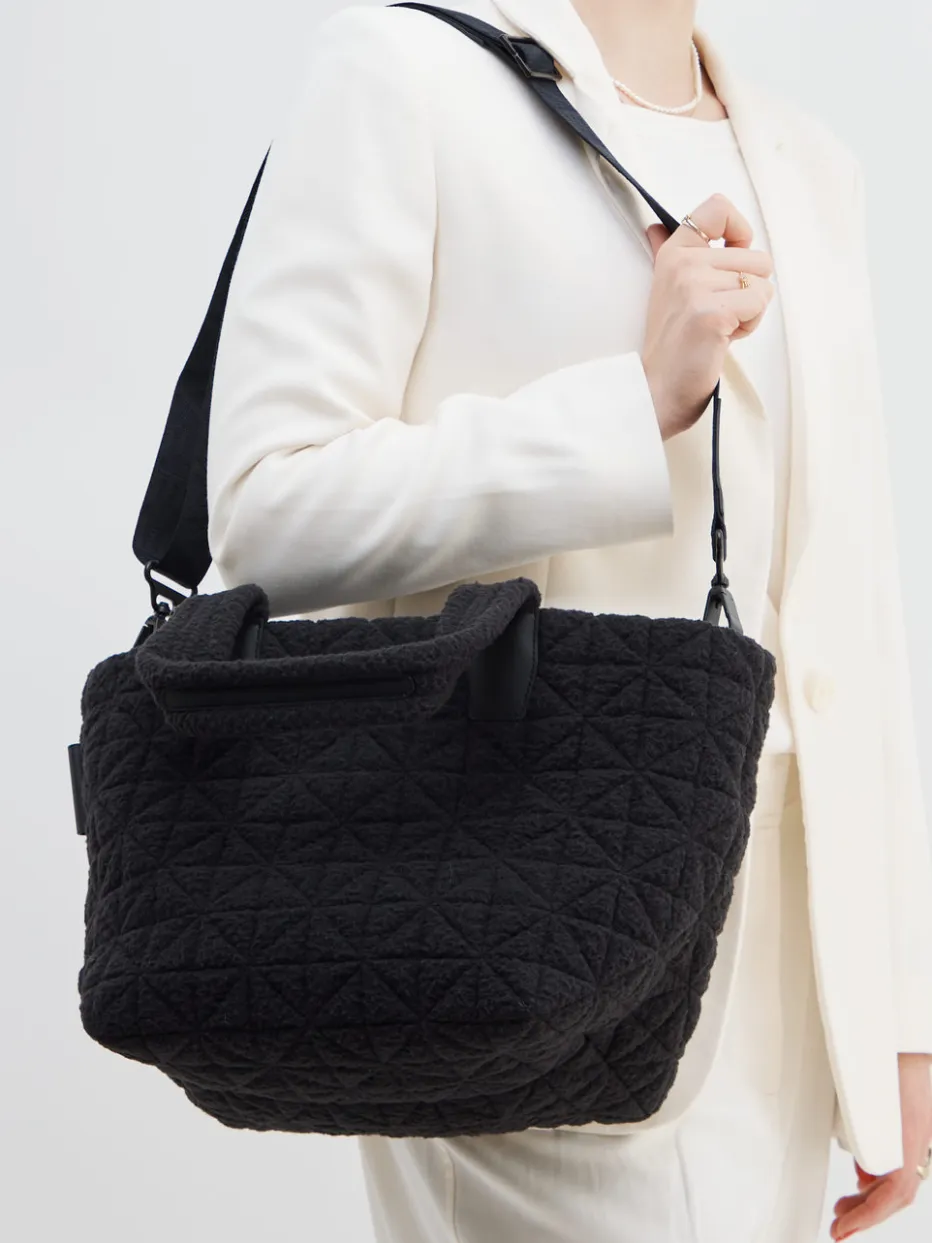 Weich, urban, alltagstauglich. Mit dieser Shopper Bag bringt VeeCollective Berlin eine stylishe Variante der Schulter- und Umhängetasche auf den Punkt. Der weich strukturierte, wasserabweisende Textilkörper in schwarzer Steppoptik vermittelt ein angenehm gepolstertes Tragegefühl – ideal für Freizeit und City. Kunstlederdetails an Griff und Riemen sorgen für Stabilität, während das Nylonfutter und der Reißverschluss praktisch durchdacht sind. Rechteckige Form, dezentes Logo am Gurt und ein verstellbarer Schulterriemen unterstreichen den unaufgeregt urbanen Charakter. Teddy-Texturen und Soft Utility machen die Tasche zu einem Fashion-Update für kuschelige Looks. VeeCollective verbindet Funktion, Design und ein modernes Gespür für Alltagstauglichkeit – garantiert vegan.