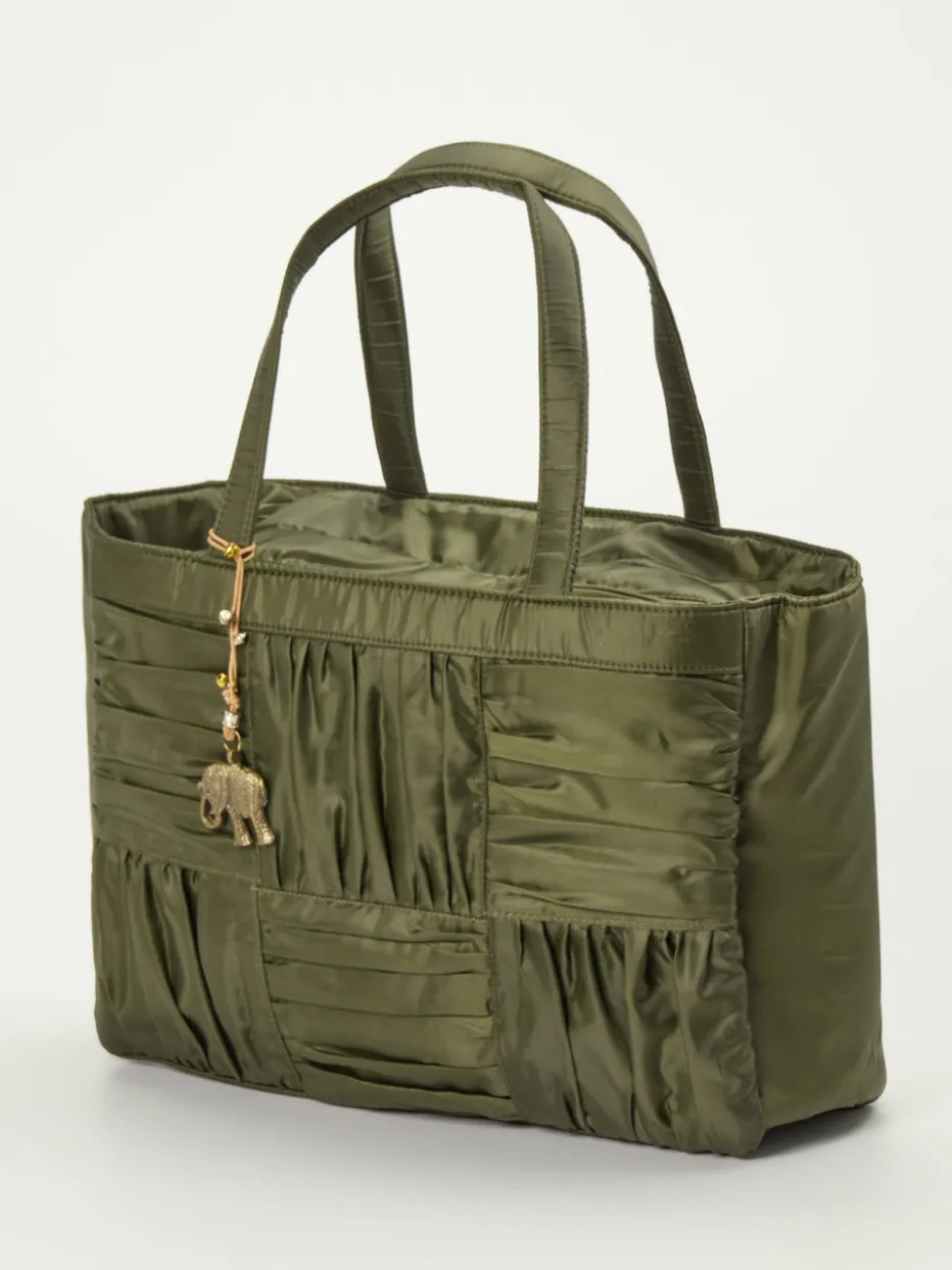 Dieser ausgefallene Shopper der Marke Anokhi zeichnet sich durch die attraktive Raffung des waldgrünen, seidigen Nylon-Obermaterials aus. Im Innenraum findet sich ausreichend Platz für all Ihre Alltagsgegenstände. Markentypisch zeigt sich der abnehmbare, mit Perlen und Glöckchen verzierte Elefanten-Anhänger. Ein alltagstaugliches und zugleich stylishes Accessoire! – Obermaterial: Nylon – Futter: Textil – Farbe: grün – Größe: ca. 30 x 50 x 10 cm (H x B x T) – Henkel: ca. 48 cm – Verschluss: Reißverschluss – Innen: ein Reißverschlussfach, zwei Steckfächer