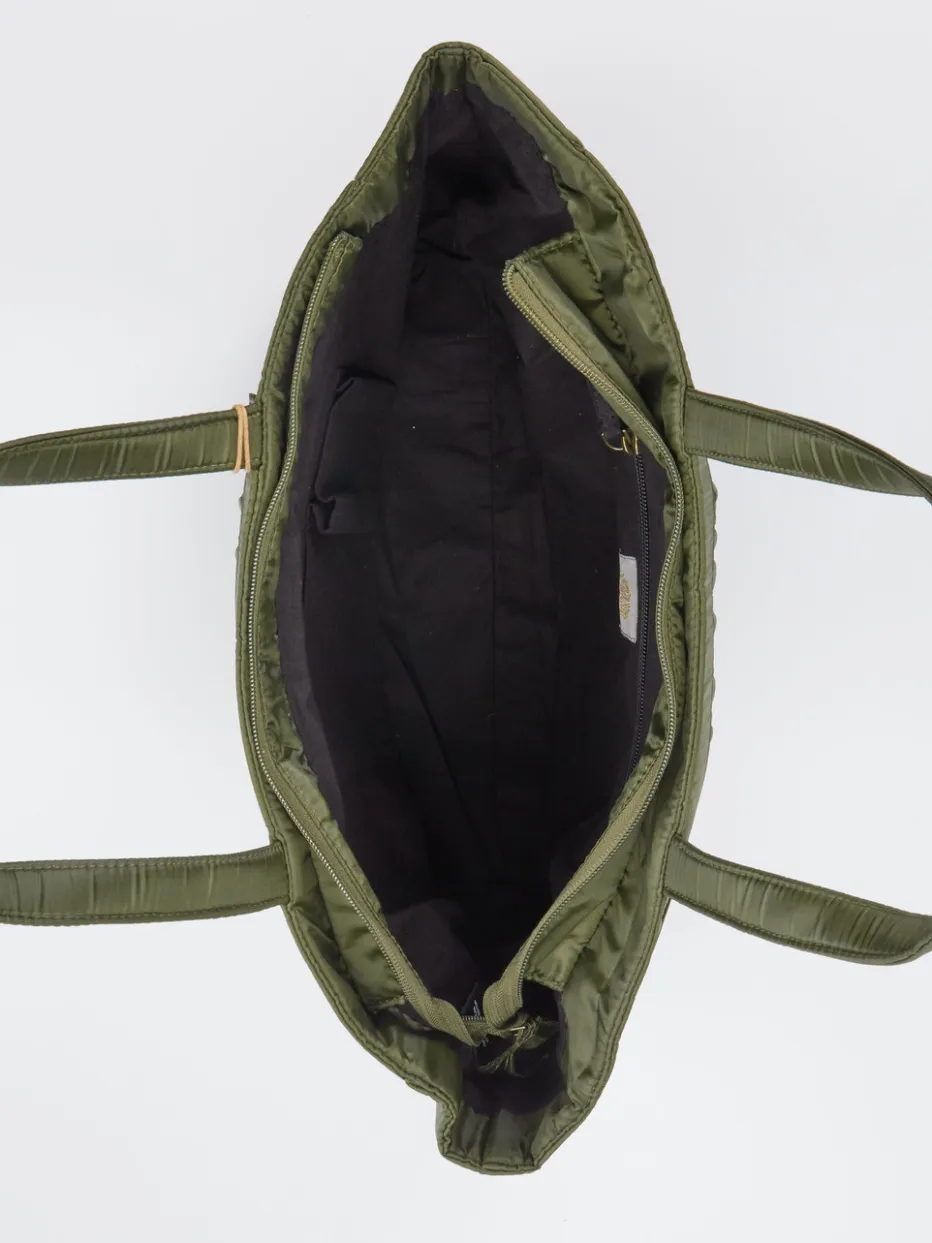Der leichte Shopper kombiniert glänzendes Nylon mit Boho-inspirierten Details und setzt mit einem goldfarbenen Anhänger stilvolle Akzente.