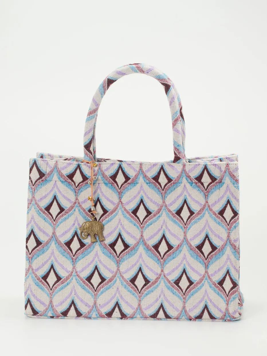 Der detailverliebt gewebte Jacquardstoff und der ikonische Elefantenanhänger verleihen diesem ANOKHI-Shopper einen ausgeprägt modischen Charakter mit Vintage-Anklängen.