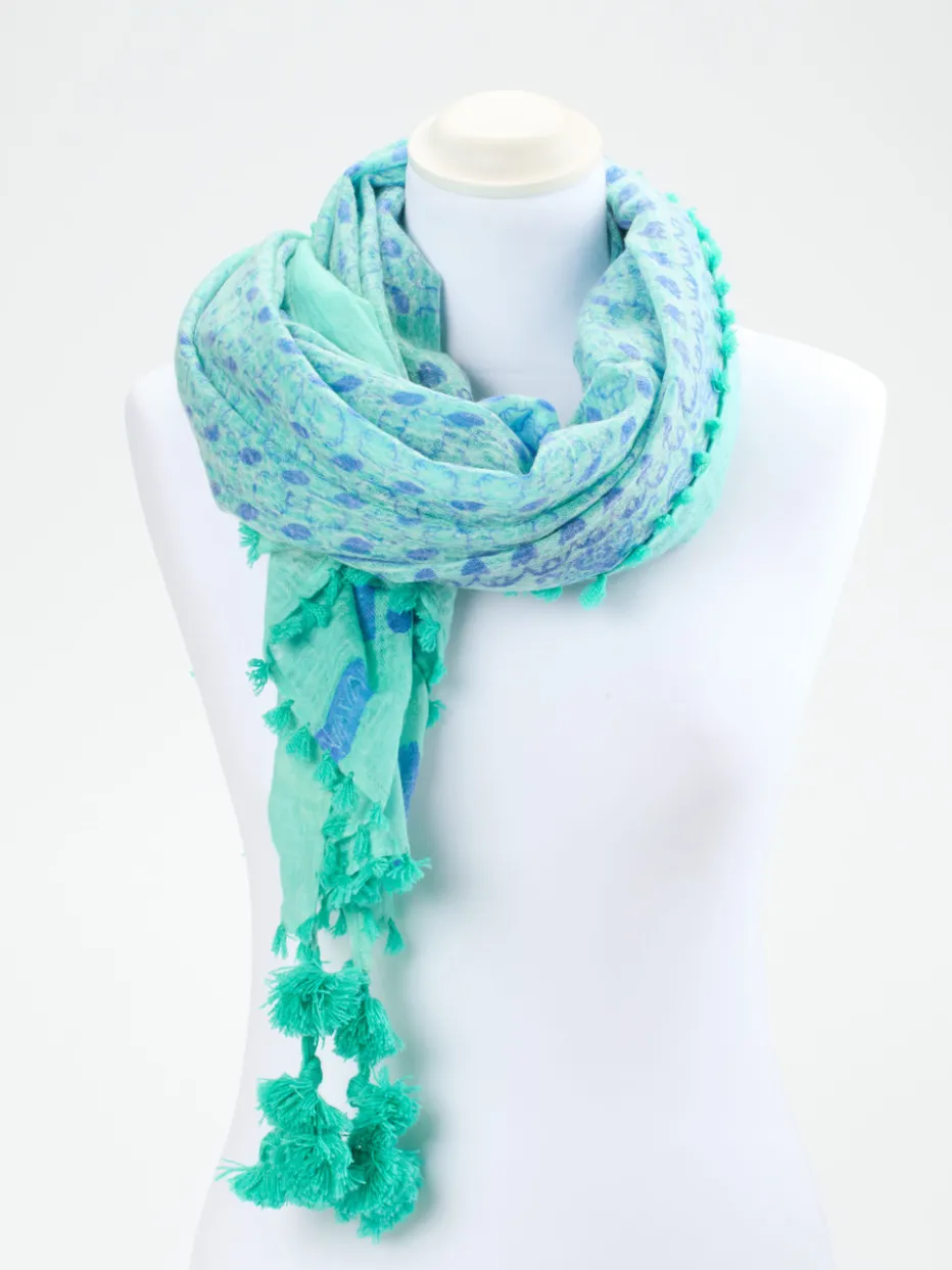 Filigrane Pompons und ein luftiges Ethno-Muster machen dieses Kaschmir-Modetuch zu einem stilvollen Begleiter für sommerliche Tage.