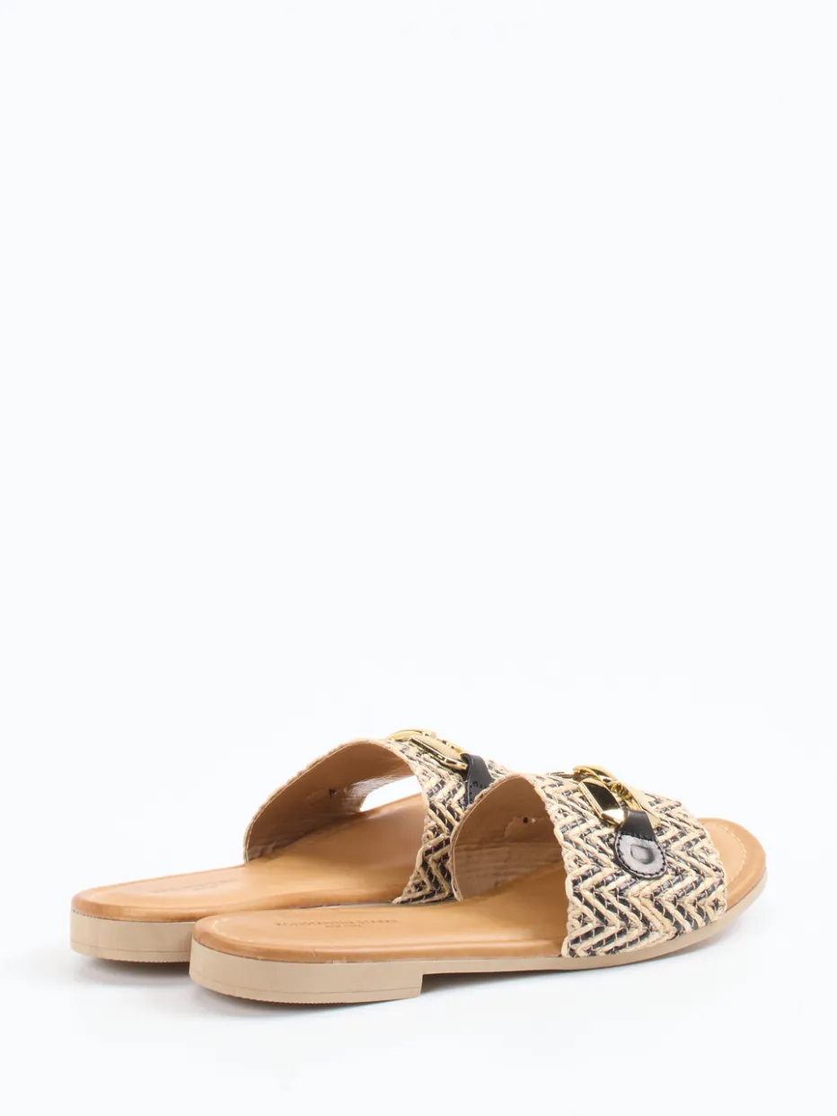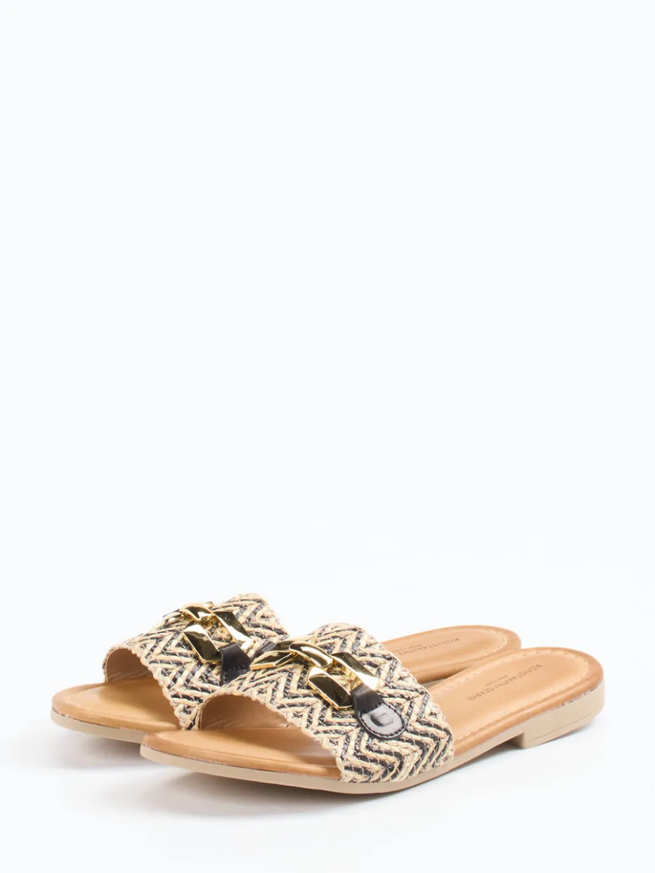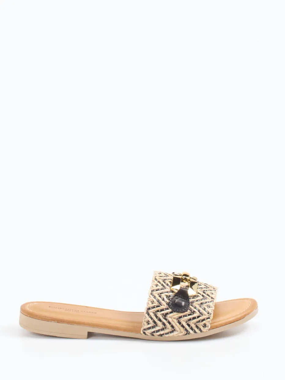 Boho-Chic für entspannte Sommertage.Konstantin Starke präsentiert diese flachen Damen-Slides mit sommerlich-relaxter Note. Ideal für Urlaubstage oder City-Walks bei warmem Wetter überzeugen diese Pantoletten durch geflochtenes Bastmaterial mit strukturierter Zickzack-Optik und einen kontrastierenden Riemen aus schwarzem Kalbleder. Die goldfarbene Gliederkette setzt ein modisches Statement, während die flache Sohle aus Gummi für Komfort sorgt. Farblich dominiert Beige mit schwarzen Akzenten, perfekt im Boho-Stil umgesetzt. Der Look fügt sich harmonisch in den „Natural Fibers SS24“-Trend ein. Understatement und Design vereinen sich zu einem smart-mediterranen Stylingobjekt mit Zumnorde-typischer Detailverliebtheit.