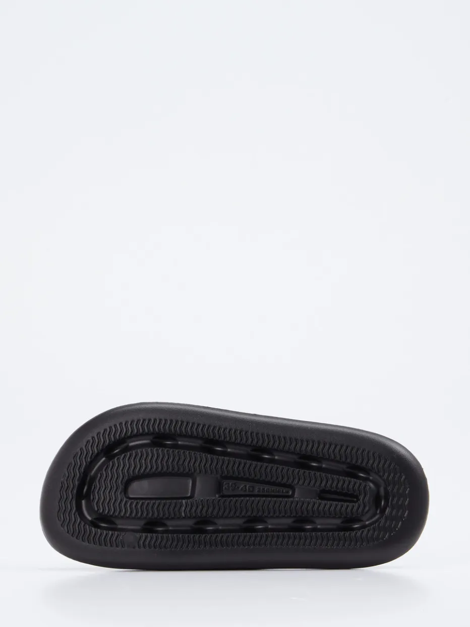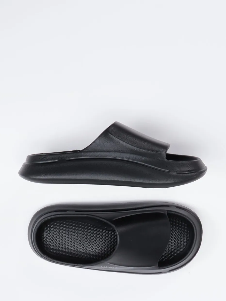 Puristisches Design trifft auf Ergonomie.Lunge präsentiert mit dieser Unisex-Badepantolette eine minimalistische Slide für Alltag, Urlaub oder Zuhause. Gefertigt aus veganem EVA-Schaum mit matter Oberfläche, bietet das Modell dank der ergonomisch gewölbten Sohle und strukturierten Innensohle besonders hohen Tragekomfort. Das tiefschwarze Design überzeugt mit klarer Silhouette, breitem Riemen und Ton-in-Ton-Branding. Der Schlupfschuh lässt sich unkompliziert kombinieren – etwa zu Shorts oder Loungewear – und steht stilistisch für Streetwear mit „Quiet Luxury“-Anmutung. Lunge verbindet unverkennbar Komfortkompetenz mit zeitgemäßer Klarheit.