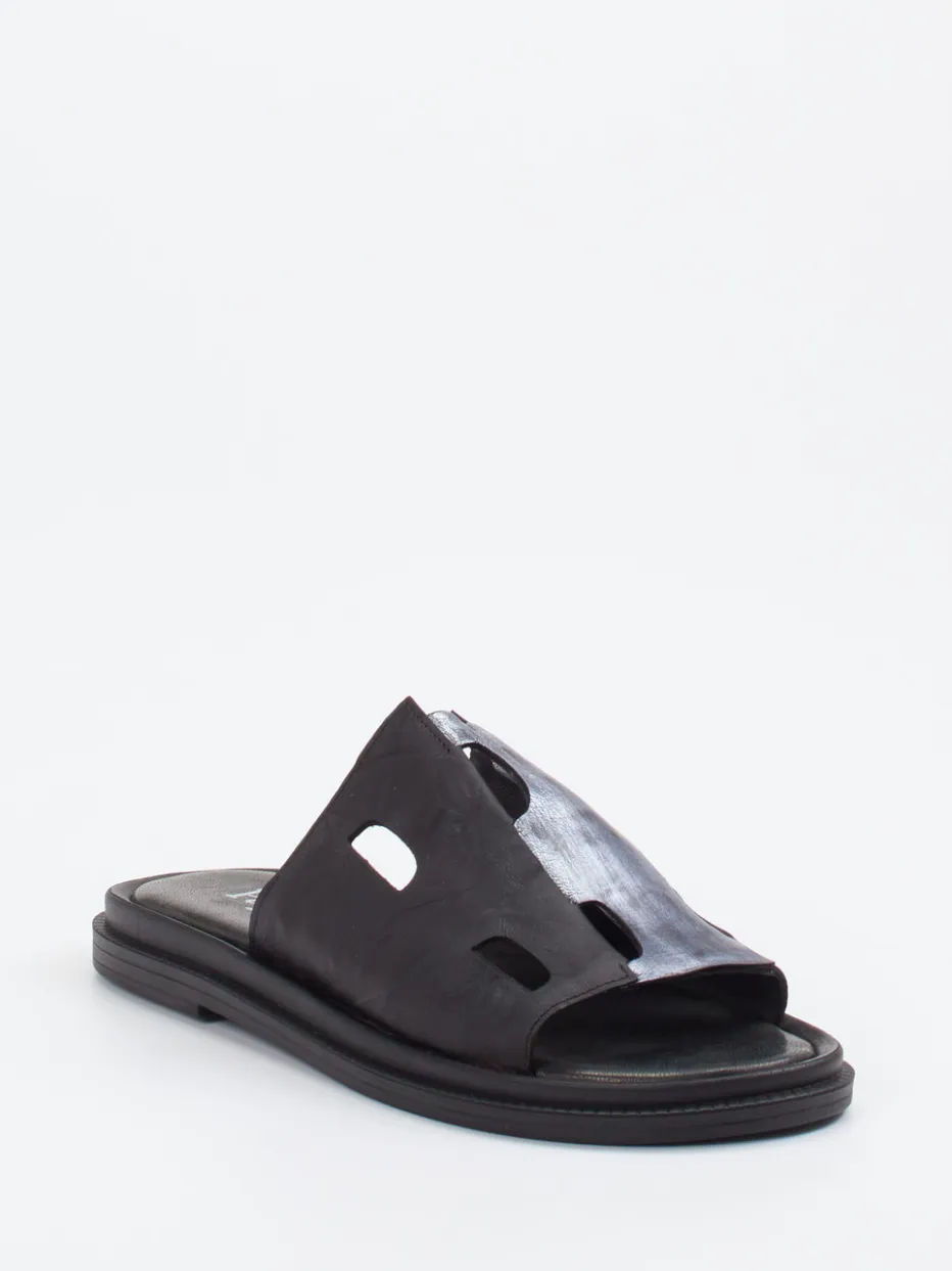 Puristische Extravaganz für warme Tage.Papucei interpretiert die klassische Damen-Slide neu. Diese Pantolette kombiniert schwarzes Känguruleder mit einem silberfarbenen Metallic-Einsatz im Used-Look. Die flache Schlupfform mit asymmetrischem Deckriemen und Cut-Outs bietet nicht nur Komfort, sondern auch optische Raffinesse. Die gepolsterte Innensohle aus Leder verschmilzt mit einer flexiblen Gummisohle samt leichtem Absatz, ideal für entspannte Stadtbummel und stilvolle Urlaubsmomente. Die edlen Metallic-Akzente setzen einen trendbewussten Akzent, inspiriert von „Quiet Luxury“ und der AW24-Metallic-Welle. Kombiniert mit Leinenhose und Metallic-Bag entsteht ein vielseitiger City-Look. Form, Finish und Tragegefühl – ein charakterstarker Schuh im typischen Papucei-Stil.