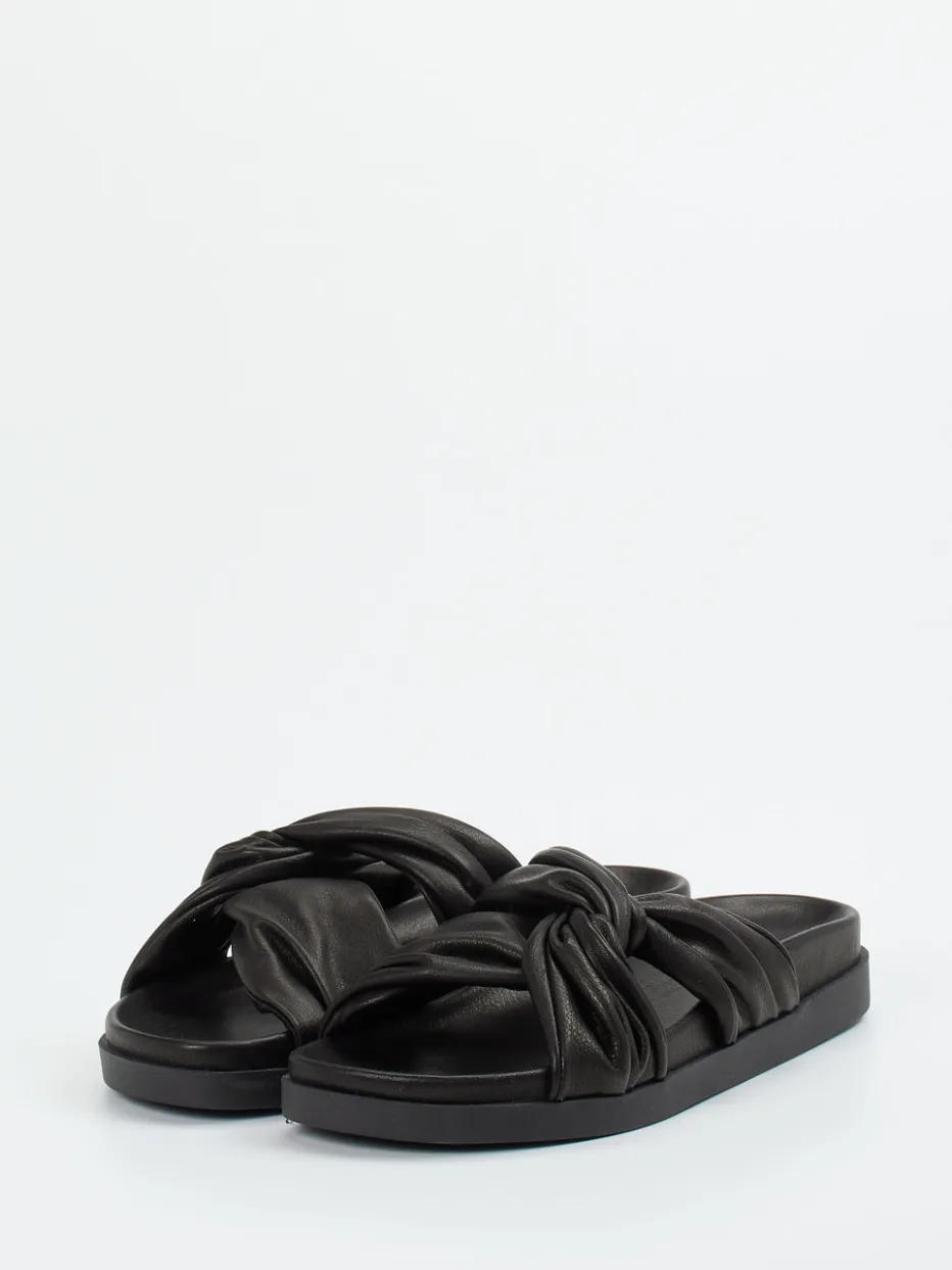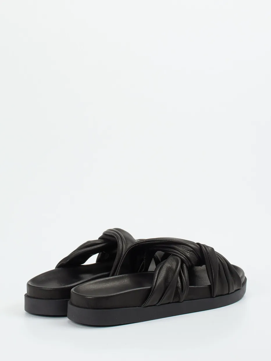 Die gepolsterten Slides verbinden hochwertiges Kalbleder mit modischer Knotenoptik und stehen für soften Komfort im minimalistischen Stil.