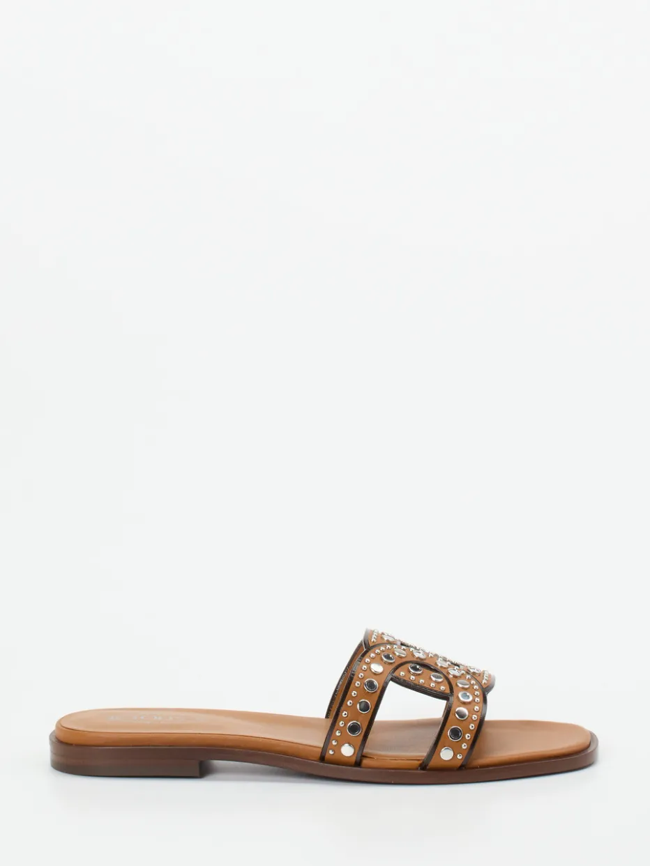 Sommerhighlight mit urbanem Chic.Tod’s präsentiert mit diesen Damen-Slides eine zeitlose Pantolette für warme Tage. Die offene Form in cognacfarbenem Kalbleder mit glänzender Oberfläche wird durch silberfarbene Nieten und dekorative Lochstanzungen zum modischen Akzent. Der angedeutete Carréleisten, ein geformtes Fußbett sowie eine flache Ledersohle bieten stilvollen Komfort für City und Strand. Schwarze Konturen unterstreichen die klare Silhouette dieser It-Pieces, die auf den Trend zu studded Details und Quiet Luxury setzen. Ideal zu weißen Sommerkleidern oder farblich abgestimmten Leder-Accessoires. Luxus und Handwerkskunst im Zeichen moderner Eleganz – made by Tod’s.