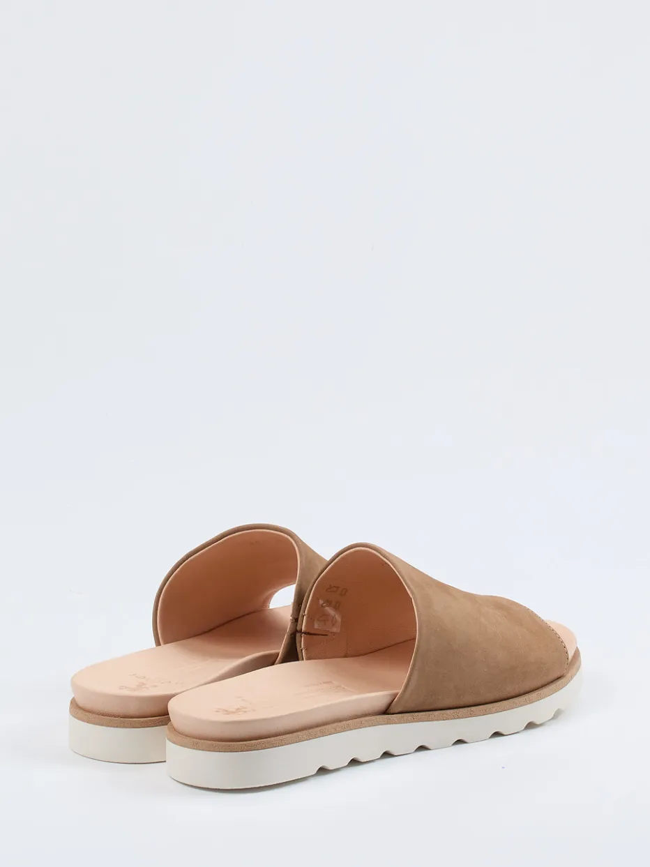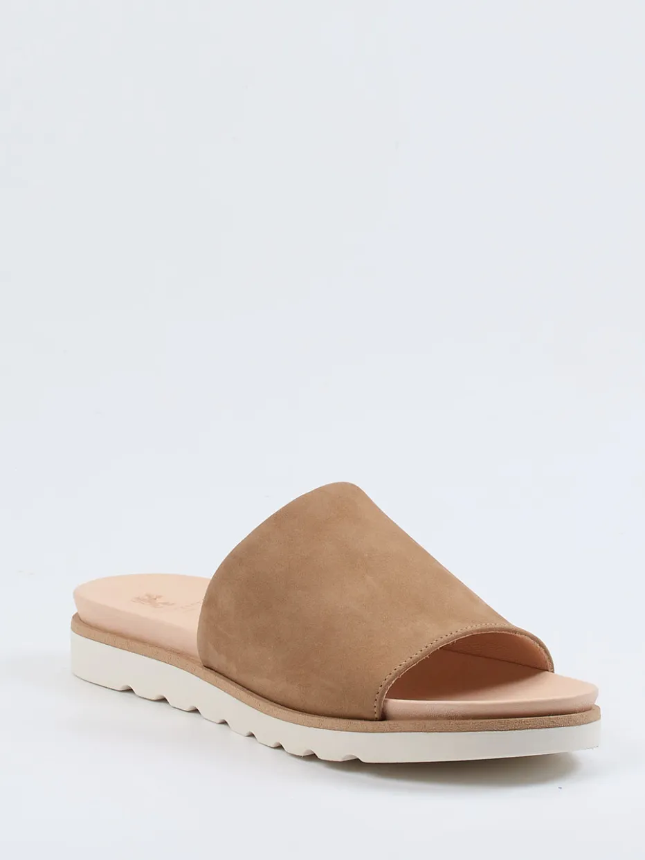 Ob bei einem Stadtbummel oder am Urlaubsort – das breite, samtige Nubukleder in Mittelbraun wirkt elegant-reduziert und angenehm weich zur Haut. Der offene, flache Schnitt betont die luftige Silhouette, während das gepolsterte Lederfußbett gemeinsam mit der rutschfesten, weiß betonten Gummisohle für Komfort und Trittsicherheit sorgt. Die natürliche Farbwelt und das cleane Design folgen dem „Quiet Luxury“-Trend der Saison. Ideal zu Leinenhosen oder entspannten Alltagslooks.