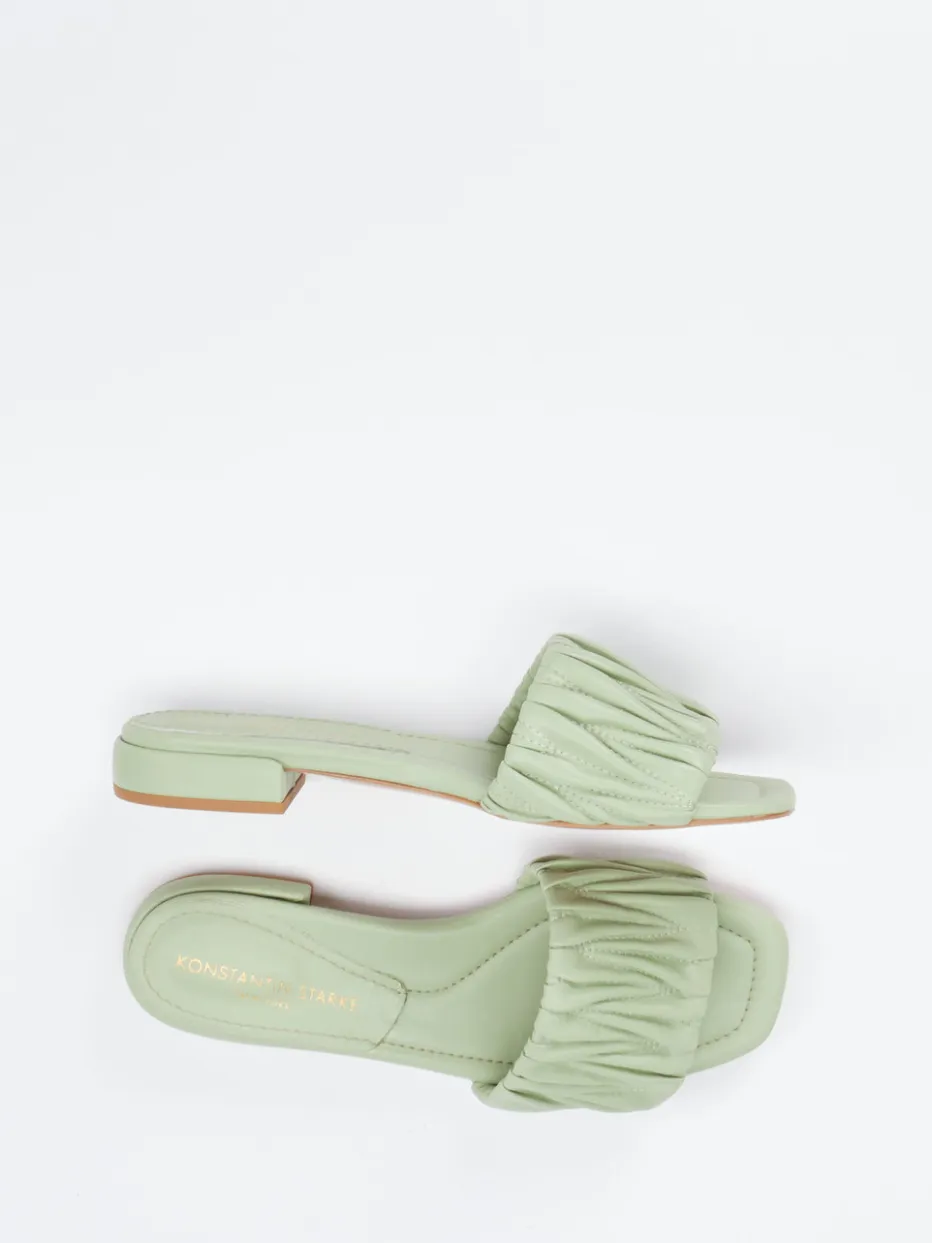 Farbakzent trifft auf Schlichtheit.Konstantin Starke präsentiert mit diesen Damen-Slides eine moderne Pantolette für entspannte Sommermomente. Ideal für den Alltag oder Urlaubsflair: Der breite, gefältelte Riemen in zartem Salbeigrün unterstreicht die dezente Formensprache dieser offenen, flachen Schuhe. Das synthetische Obermaterial mit matter Oberfläche sorgt für leichte Pflege, während die gepolsterte Innensohle auf der Carré-Leiste angenehm stützt. Die kontrastfarbene Lederlaufsohle setzt einen raffinierten Designakzent. Stilistisch verortet im „Quiet Luxury“-Trend, passen sie wunderbar zu natürlichen Tönen und luftigen Materialien. Der feminine Look vereint Trendfarbe mit gehobenem Komfortanspruch.