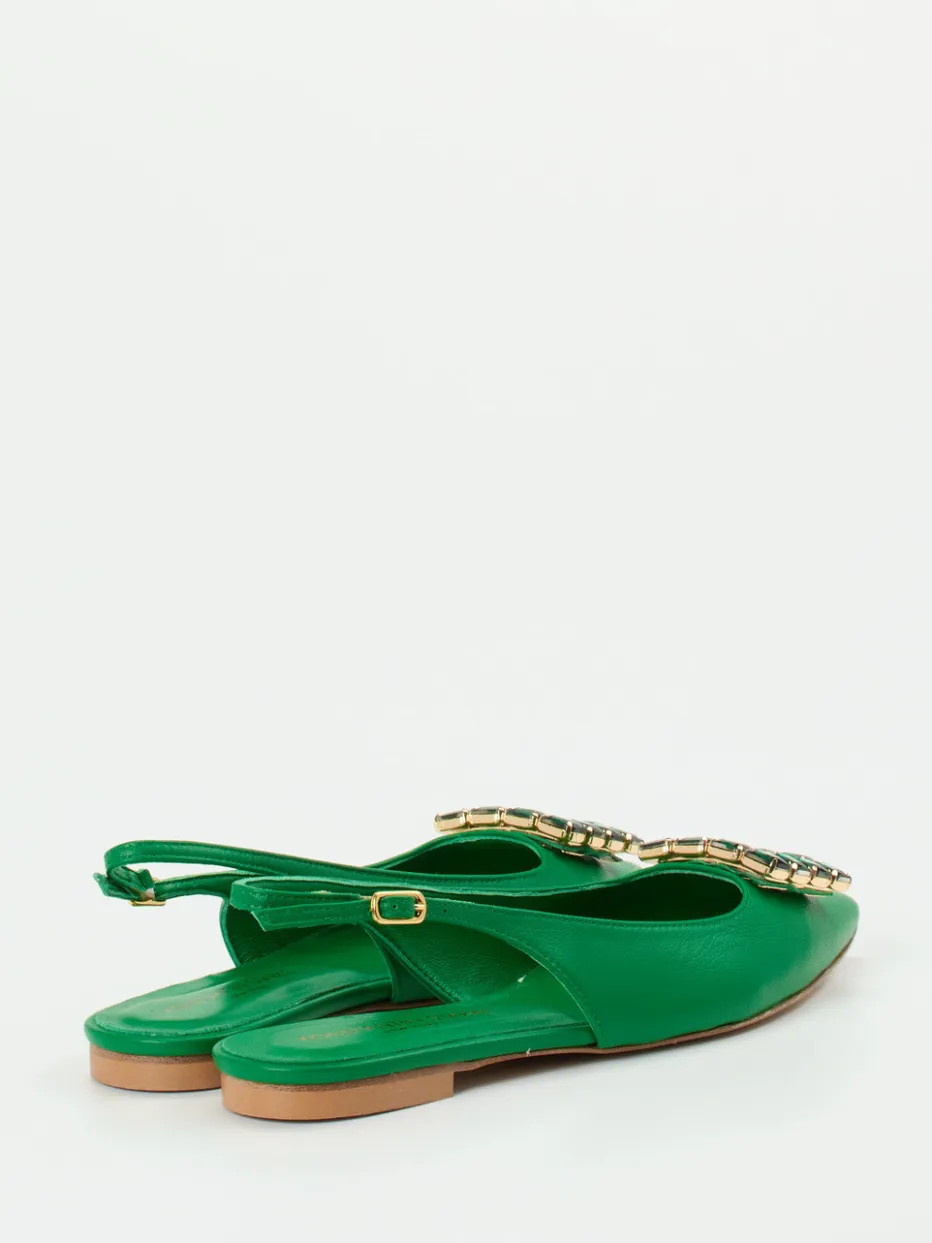 Diese Slingback-Ballerinas vereinen edles Lammleder mit einem strahlenden Smaragdton und setzen auf subtile Eleganz im Look der 90er. Ideal für modebewusste Trägerinnen mit klassischem Anspruch.