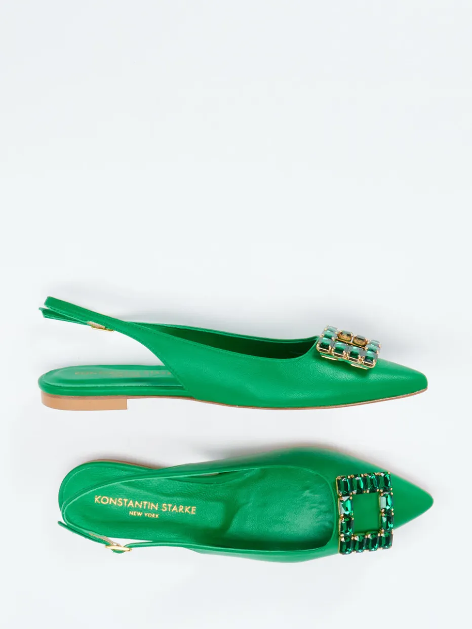 Eleganz mit funkelndem Akzent.Konstantin Starke präsentiert einen stilvollen Slingback-Ballerina für Damen. Ein flacher Schuh für warme Tage und besondere Anlässe – gefertigt aus hochwertigem, smaragdgrünen Lammleder mit glänzender Oberfläche. Die spitz zulaufende Form unterstreicht die feminine Silhouette, während die goldfarbene Schmuck-Schnalle mit grünen Kristallen für einen luxuriösen Blickfang sorgt. Ein verstellbarer Fersenriemen mit zarter Dornschließe sorgt für Stabilität. Lederfutter und gepolsterte Ledersohle erhöhen den Komfort. Im Stil von „Quiet Luxury“ harmoniert das Modell perfekt mit schlichten Kleidern oder farblich abgestimmten Accessoires. Ein sommerlicher Begleiter mit detailverliebter Handschrift von Konstantin Starke.