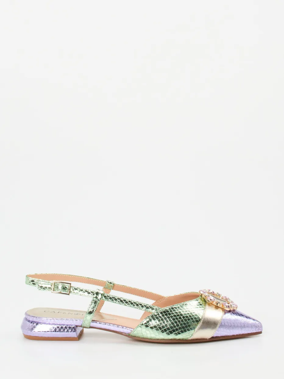 Extravaganz für besondere Stunden.CAFèNOIR präsentiert modische Slingback-Ballerinas für Damen mit effektvoller Farbgebung in Flieder, Mint und Gold. Ideal für festliche Events oder stilbewusste Abende: Das Metallicleder mit schimmernder Schlangenprägung vereint Farbenfreude mit einer glamourösen Oberfläche. Die spitze Form, ein verstellbarer Fersenriemen mit goldfarbener Schließe und eine dekorative Strassapplikation auf dem Vorderblatt runden das expressive Design ab. Dank leicht gepolsterter Lederinnensohle und 2 cm Absatzhöhe überzeugen diese Ballerinas auch funktional. Outfits im Y2K-Stil oder minimalistische Ensembles profitieren vom auffälligen Akzent dieser Schuhe. CAFèNOIR steht hier für femininen Stil mit luxuriöser Ausstrahlung.