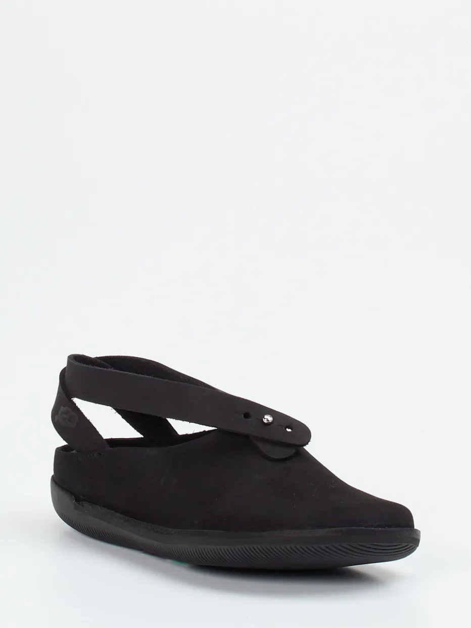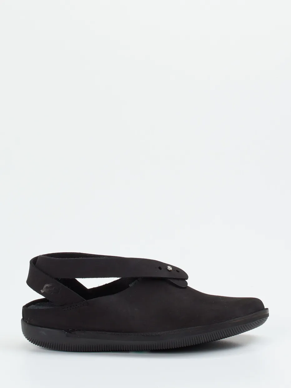 Die unisex Slingback-Clogs sind aus tiefschwarzem Nubukleder gefertigt – samtig angeschliffen und mit mattem Finish. Die geschlossene Silhouette vorne trifft auf eine offene Ferse mit verstellbarem Riemen, der durch einen silberfarbenen Druckknopf akzentuiert wird. Die profilierte Gummisohle sorgt für Trittsicherheit im urbanen Umfeld. Geprägt vom Trend „Quiet Luxury“ überzeugt das Modell mit klarer Formensprache und ergonomischer Passform. Kombiniert mit Baumwollsocken entsteht ein stilvoller Look für zu Hause und Stadtspaziergänge.