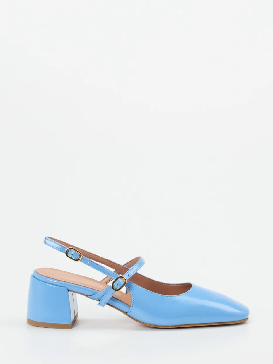 Die Marke Konstantin Starke präsentiert stilvolle Damen-Slingback-Pumps mit himmelblauem Lackleder-Finish.