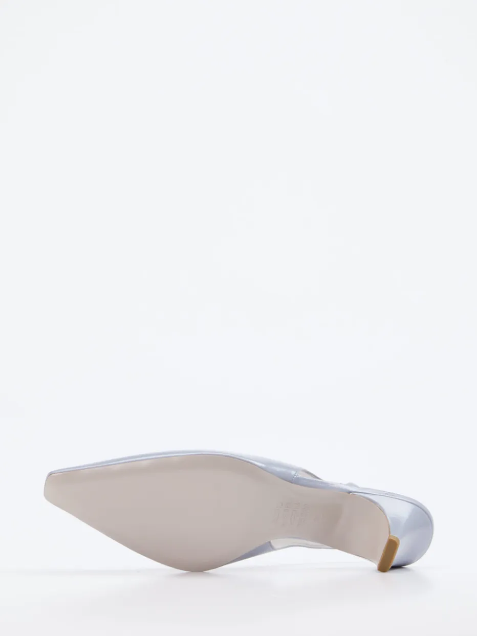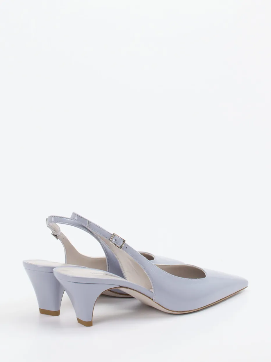 Fein schimmerndes Lackleder und eine spitz zulaufende Silhouette machen diesen Slingback zu einem stilvollen Element moderner Eleganz. Perfekt abgestimmt auf den Pastelltrend der Saison.