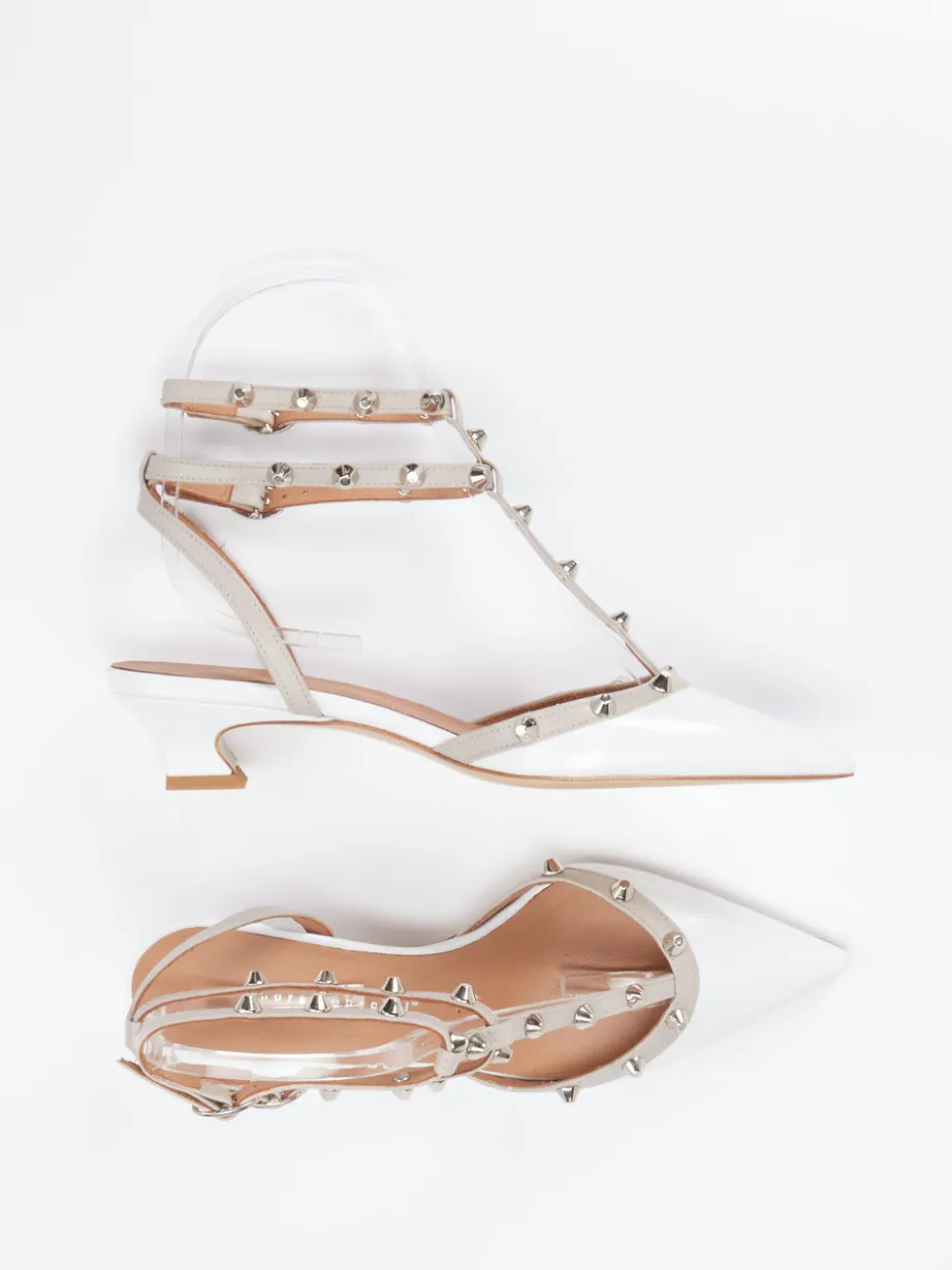 Bei Ausgehanlässen oder stilvollen City-Tagen überzeugen die Pumps mit ihrem glänzenden Lackleder in frischem Weiß, ergänzt durch eine spitz zulaufende Silhouette. Silberfarbene Nieten und kontrastfarbene T-Riemen sorgen für markante Akzente im Stil des Rock-Chic. Die verstellbaren Knöchelriemen garantieren einen passgenauen Sitz, während der 3,5 cm hohe Kitten Heel und die gepolsterte Lederinnensohle bequemen Tragekomfort bieten. Ideal kombinierbar mit Midirock oder heller Skinny Jeans für trendige Auftritte.