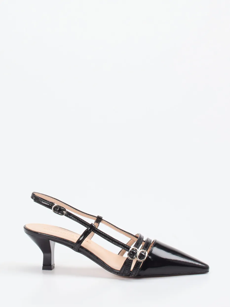 Feines Lackleder, eine spitz zulaufende Form und silberne Doppelschnallen machen diesen Slingback zu einem stilbildenden Element moderner Garderoben.