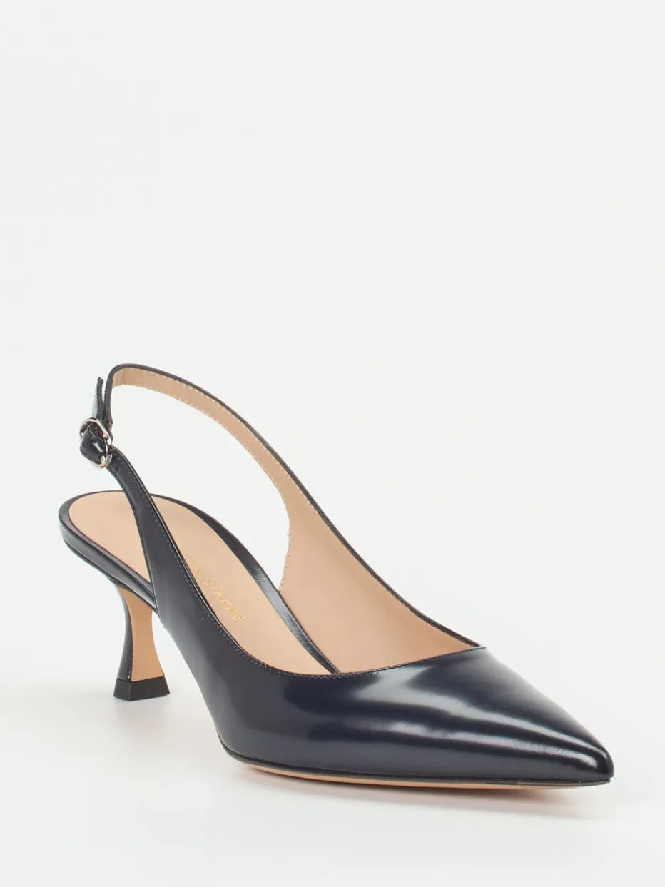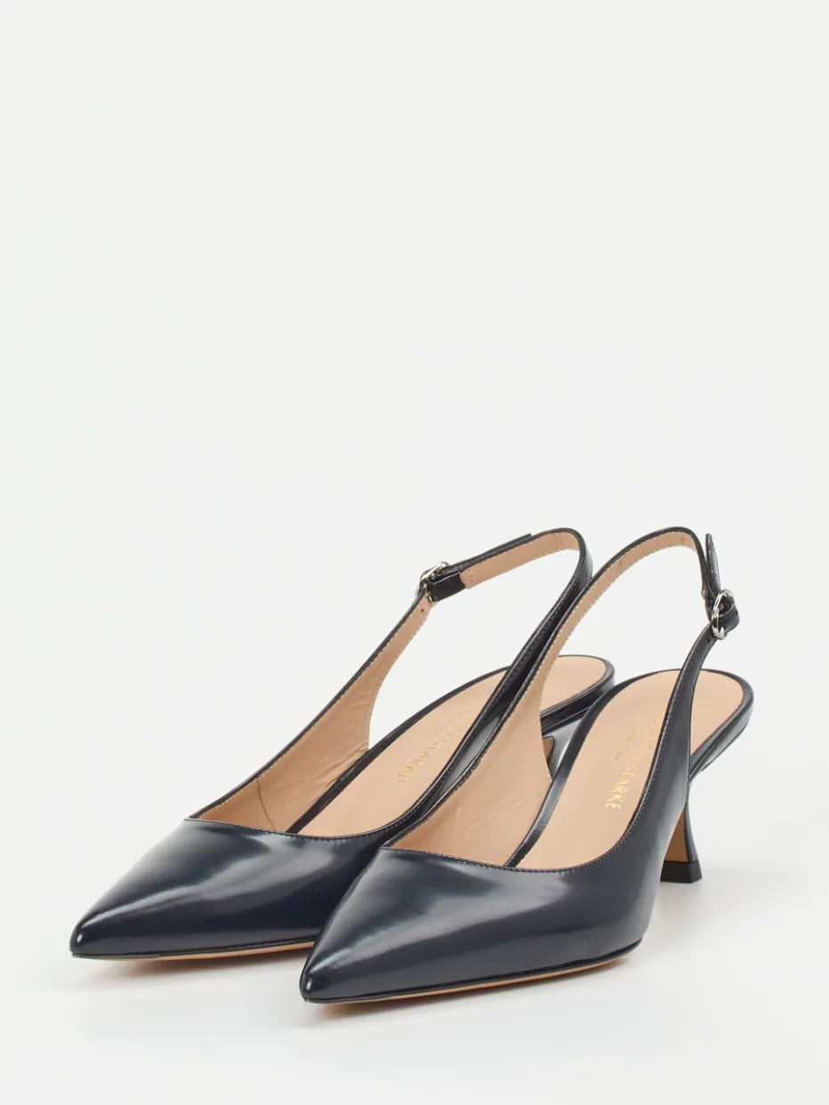 Diese Slingback-Pumps verbinden dunkelblaues Hochglanzleder mit einem femininen Kitten Heel – ein stilvoller Klassiker mit modernem Understatement.