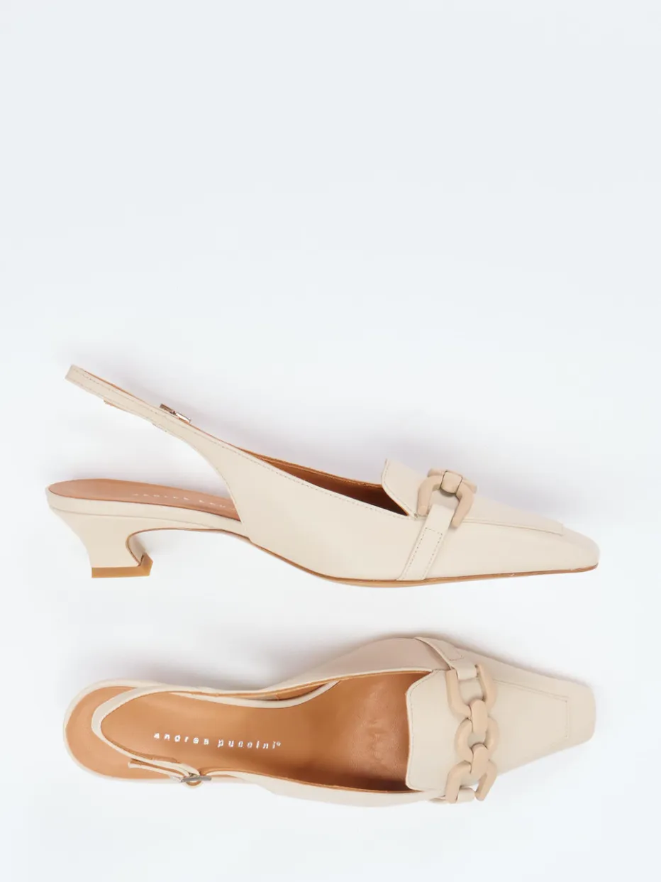 Sommerliche Eleganz mit leiser Raffinesse.Andrea Puccini interpretiert klassische Damenpumps neu: Diese Slingback-Pumps aus hochwertigem Lammleder in softem Beige verbinden Komfort und zeitlosen Stil. Für formelle Anlässe oder den gepflegten Büroalltag bietet das Modell mit seiner spitz zulaufenden Silhouette und dem 3,5 cm hohen Kitten Heel eine stilsichere Option. Mattes Leder, feine Ton-in-Ton-Ziernähte und eine dezente Kettendekoration unterstreichen den „Quiet Luxury“-Charakter. Der individuell einstellbare Fersenriemen mit silberfarbener Schnalle sorgt für passgenauen Halt. Harmoniert ideal mit monochromen Office-Looks oder fließenden Sommerkleidern. Ein feminines Statement-Piece – modern interpretiert mit dem Anspruch italienischer Handwerkstradition.