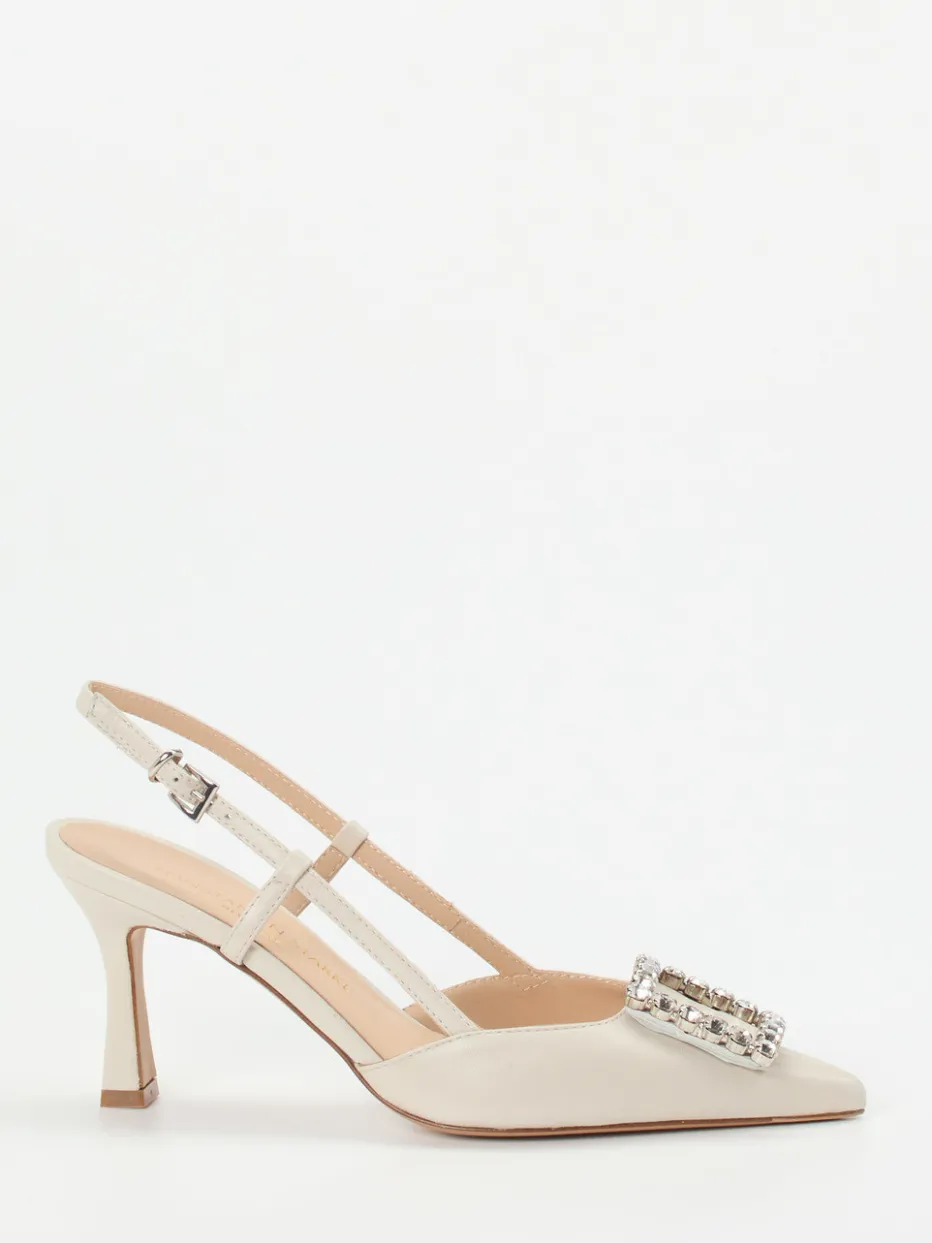 Die cremefarbenen Slingpumps aus feinem Lammleder verbinden Vintage-Flair mit modernem Understatement. Edel akzentuiert durch eine Strassverzierung, bieten sie sicheren Halt und feminine Eleganz.