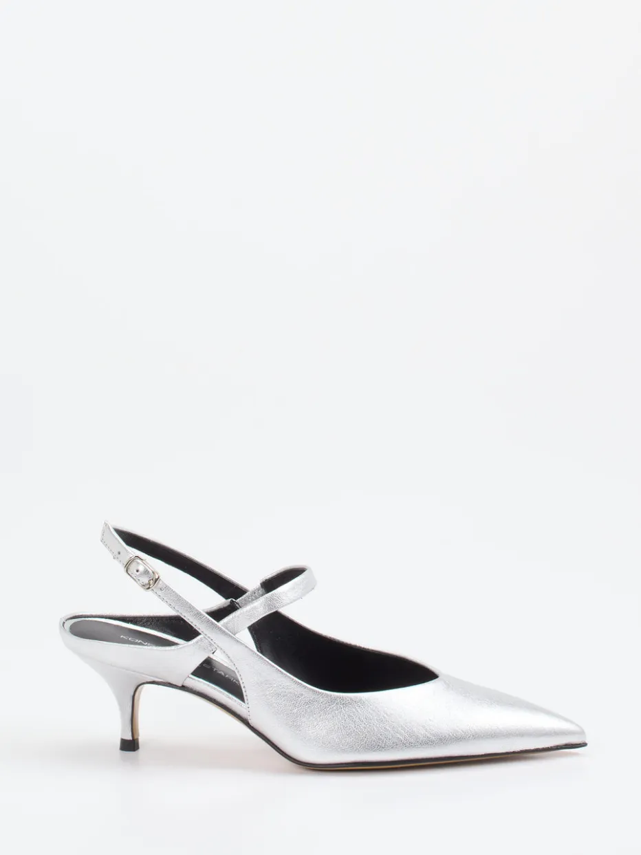 Die Marke Konstantin Starke präsentiert elegante Slingback-Pumps für Damen, perfekt für festliche Anlässe. Bei Empfängen oder Dinner-Events überzeugt das Modell durch seine spitz zulaufende Form und glänzendes Metallicleder in Silber. Das schmale Fersenriemchen mit silberfarbener Schnalle bietet optimalen Halt. Die Kombination aus dezentem Kitten Heel und Ledersohle sichert Komfort und Stil. Inspiriert vom Y2K-Revival und Minimalismus wirken sie modern und gleichzeitig zeitlos. Silberfarbene Accessoires oder eine Clutch in Metallic-Optik unterstreichen den Look. Ein feminines Statement mit dezenter Vintage-Note und hochwertiger Verarbeitung.