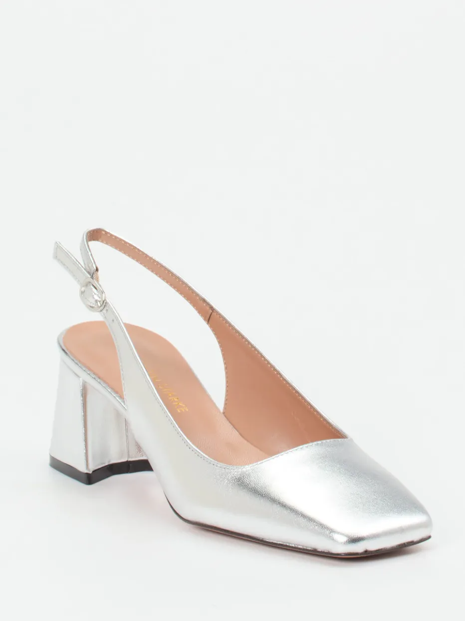 Elegante Slingpumps mit glänzendem Silber-Finish und komfortablem Blockabsatz – ideal für moderne Retro-Looks mit Stilbewusstsein.