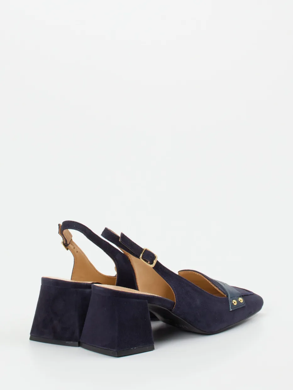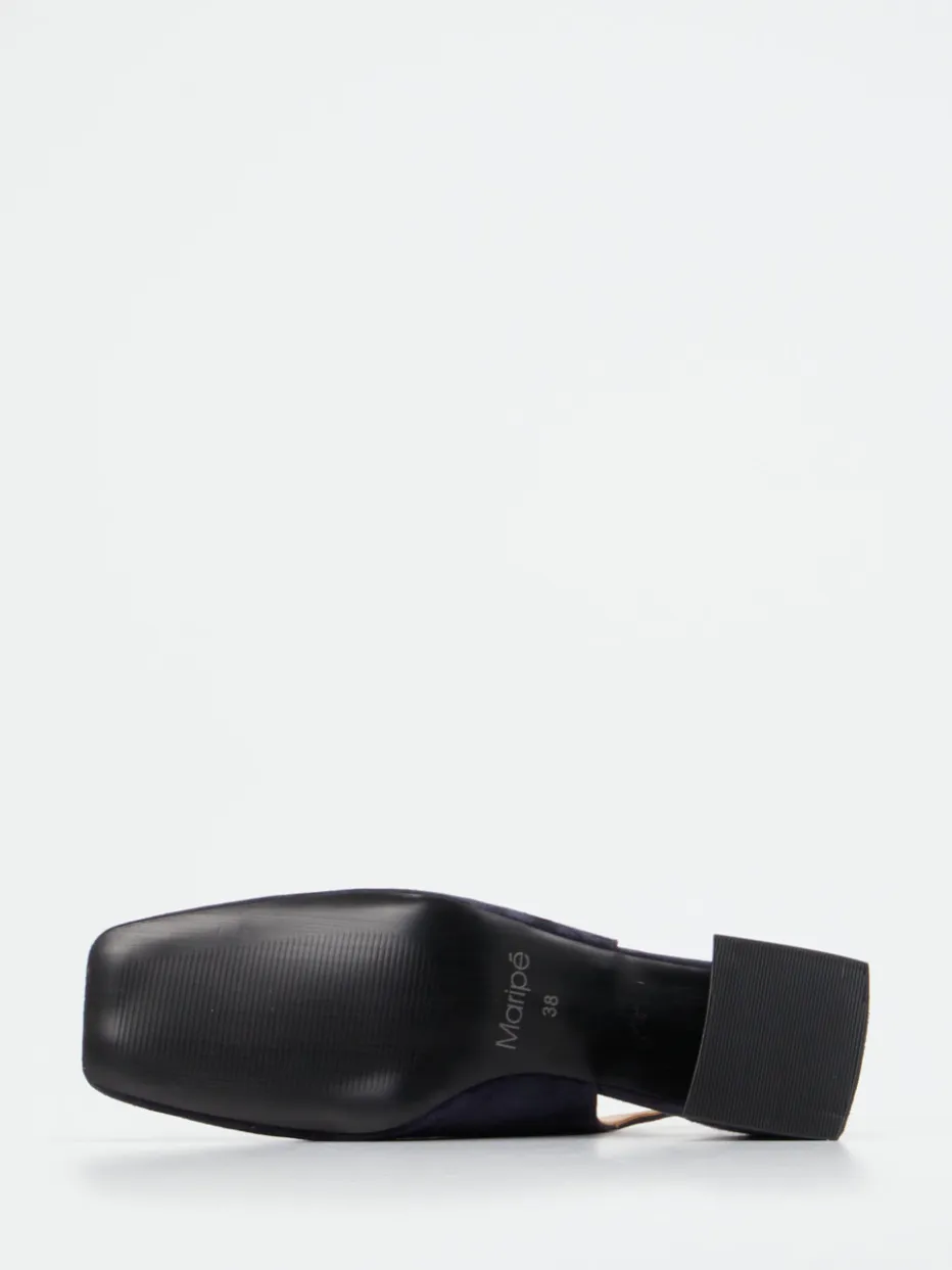 Business-Charme mit Retro-Flair.Maripé präsentiert feminine Slingback-Pumps für Anspruch und Alltag. Ideal für elegante Office-Looks oder souveräne City-Styles überzeugt das Modell durch hochwertiges, samtig angeschliffenes Veloursleder in Dunkelblau. Die klare Linienführung kombiniert sich mit einem stabilen Blockabsatz, verstellbarem Fersenriemen und goldfarbenen Nieten auf der strukturierten Zierspange. Gummilaufsohle und Lederfutter bieten Komfort und Trittsicherheit. Trendaffin fügt sich der Schuh in die „Quiet Luxury“-Strömung ein und passt perfekt zu einem cremefarbenen Blazer oder einer Lederhandtasche in Navy. Ein stilvoller Begleiter – klassisch, souverän, Maripé.