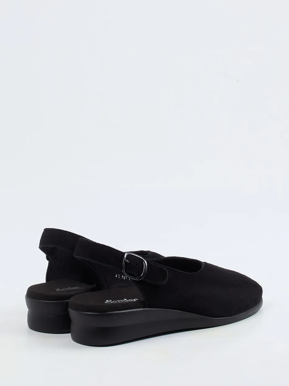 Reduzierte Eleganz für warme Tage.Semler zeigt mit dieser Damen-Slingback-Sandale eine stilvolle Interpretation komfortorientierten Designs. Dank tiefschwarzem Samtziegen-Veloursleder mit matter Oberfläche passt das Modell ideal zu minimalistischen Sommer-Looks. Die offene Ferse, verstellbare Schnalle und Peep-Toe-Front sorgen für Leichtigkeit und Belüftung. Das ergonomisch geformte Fußbett sowie die leichte PU-Luftpolstersohle mit 3 cm leichtem Keilabsatz garantieren ganztägigen Tragekomfort. Klar konturiert und mit Ton-in-Ton-Nähten gestaltet, fügt sich die Sandale in ruhige „Quiet Luxury“-Looks und bewährt sich im Alltag. Ein Modell mit gelungener Balance aus Komfort, Stil und Markenqualität.