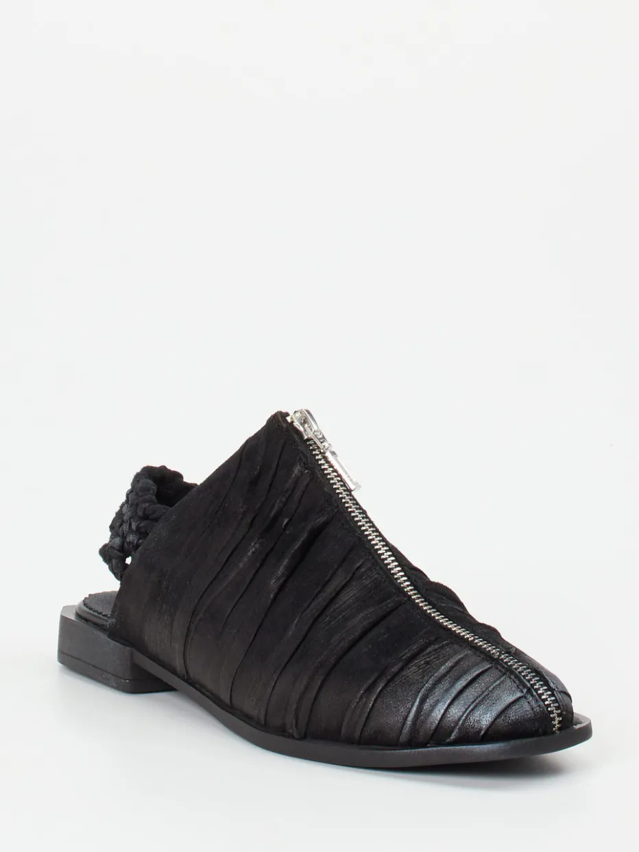 Modemut in mattem Schwarz.Papucei interpretiert Slingback-Schuhe neu – in mattem, tiefschwarzem Veloursleder mit spannender Faltenstruktur. Für stilvolle Alltagsmomente und aufregende Sommernächte bietet dieses Modell außergewöhnlichen Komfort und progressive Ästhetik. Der asymmetrisch platzierte, silberfarbene Reißverschluss zieht sich mittig über das Blatt bis zur Spitze und verleiht dem geschlossenen Vorderteil eine klare Linie. Ein flexibler, geflochtener Fersenriemen komplettiert das offene Fersendesign. Die schwarze Gummisohle sorgt für Alltagstauglichkeit – rutschfest und bequem. Ideal für trendorientierte Looks, lässt sich der Schuh mit minimalistischen Taschen oder Culottes kombinieren. Papucei steht für innovatives Design mit hohem Stilbewusstsein.