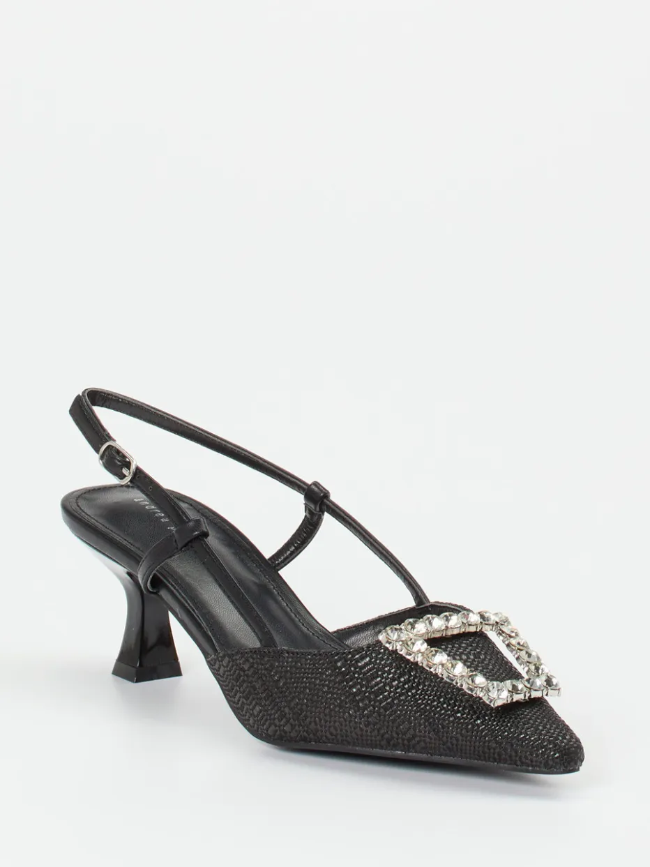 Glamouröse Raffinesse für besondere Abende.Andrea Puccini präsentiert mit diesem Damen-Slingpumps einen ausdrucksstarken Akzent für festliche Garderoben. Schwarzes Flechtleder auf spitz zulaufender Silhouette trifft auf eine glamouröse Strassschnalle, ergänzt durch ein feines Fesselriemchen mit silberfarbener Schließe. Der grazile Kitten Heel mit glänzender Oberfläche verleiht dem Design eine elegante Vintage-Note. Die Gummisohle sorgt für angenehmen Auftritt bei Events oder stilvollen Dinnern. Perfekt kombinierbar mit einer Strass-Clutch oder einem klassischen schwarzen Kleid. Ein Detailstarkes Modell mit italienischer Eleganz und trendbewusster Aussage.
