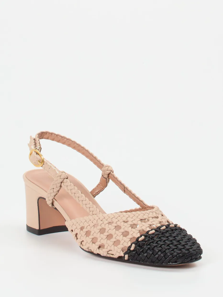 Geflochtenes Flechtleder und zweifarbige Akzente verbinden sich bei diesem Slingpumps zu einem stilvollen Sommermodell mit mediterraner Anmutung.