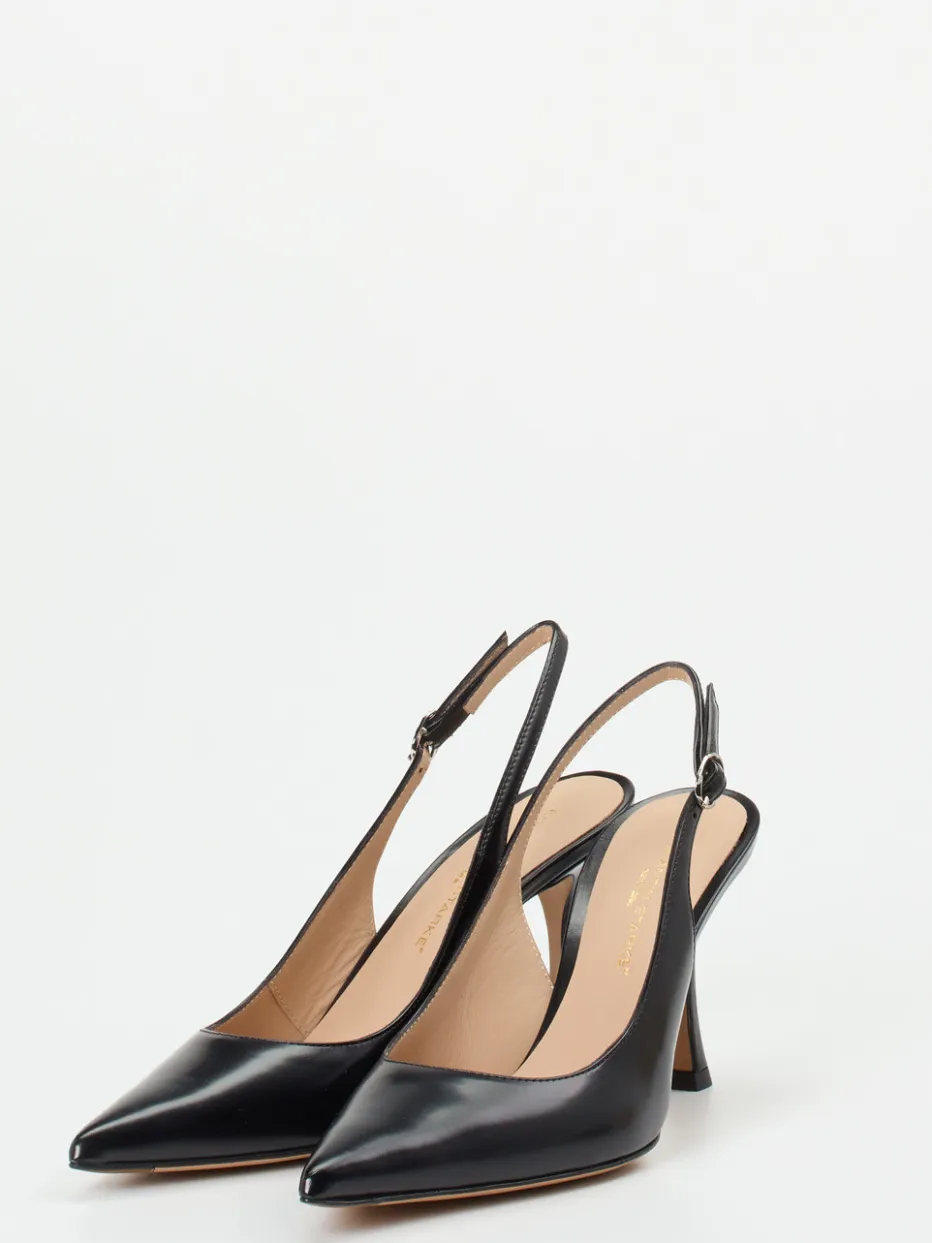 Mit edlem Hochglanzleder, spitzer Silhouette und geschwungenem Kitten Heel interpretieren diese Slingpumps Minimalismus im Retro-Look neu.