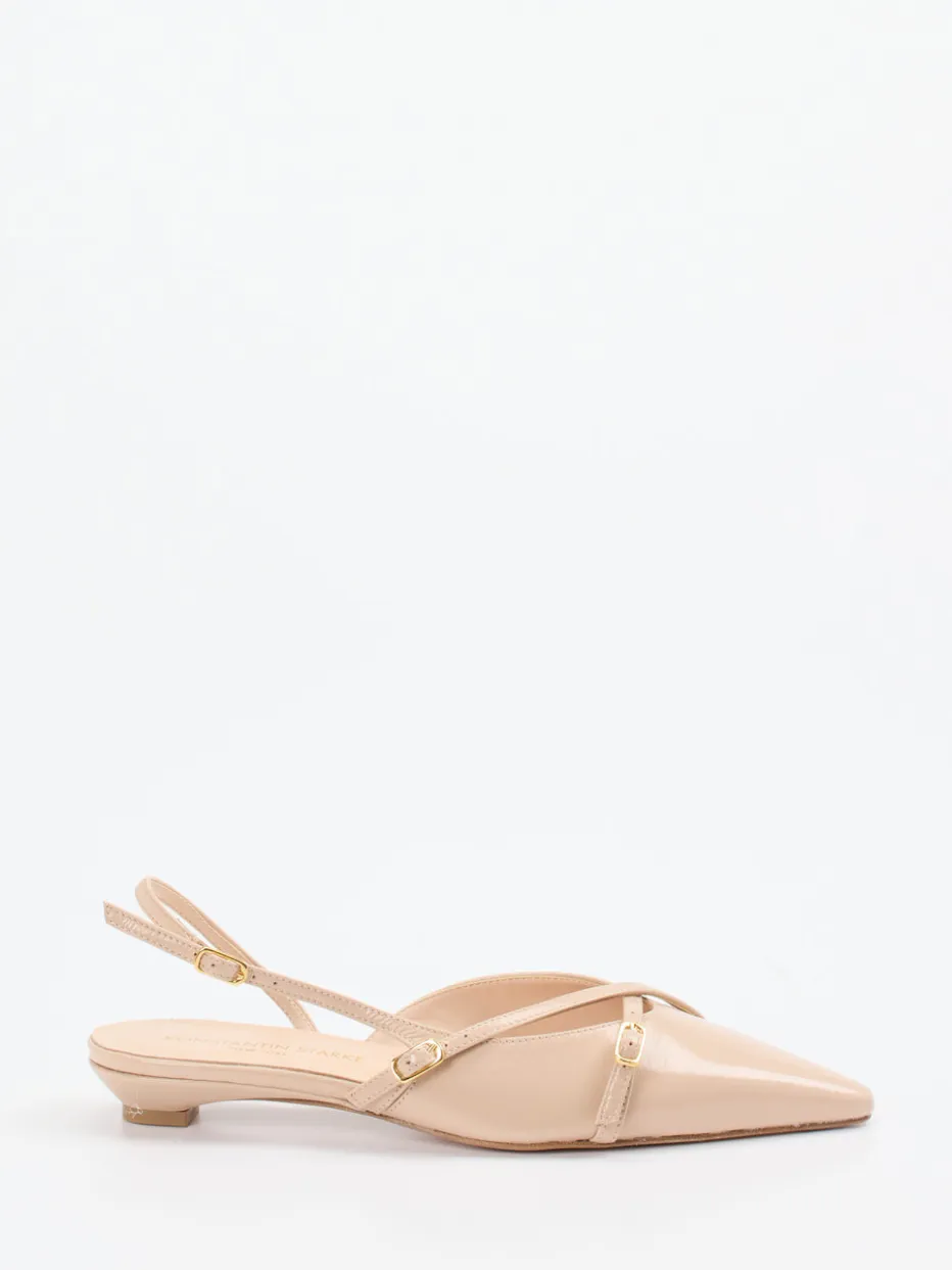 Filigraner Chic mit femininer Note.Konstantin Starke interpretiert die klassische Slingpumps-Silhouette neu. Ideal für formelle Anlässe im Frühling oder stilbewusste Büro-Outfits bietet das Modell aus hochwertigem, glänzendem Lackleder in Nude eine spitz zulaufende Form mit verstellbaren, goldfarbenen Riemenschnallen und offener Ferse. Der schmale Kitten Heel verleiht dem Look Leichtigkeit und Eleganz, während das weiche Lammnappafutter angenehmen Tragekomfort garantiert. Die Ledersohle mit rutschhemmender Intarsie sorgt für sicheren Halt. In Kombination mit Seidenbluse oder Clutch ein gelungenes Statement für „Quiet Luxury“. Stilvoller Minimalismus mit raffinierter Detailverliebtheit – Konstantin Starke Qualität trifft modernes Design.