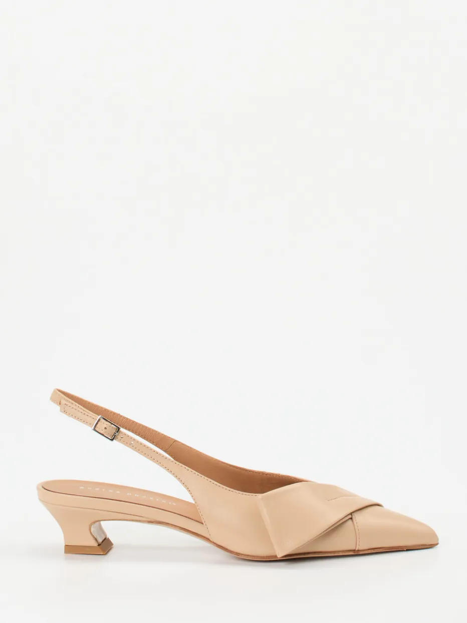 Fein gearbeiteter Sommerklassiker.Andrea Puccini interpretiert klassische Slingpumps mit femininer Leichtigkeit. Ideal für den Sommer: Das Modell kombiniert weiches, beigefarbenes Lammleder mit matter Oberfläche und überkreuzten Leder-Applikationen auf der spitzen Front. Verstellbarer Fersenriemen mit Metallschnalle und ein geschwungener Kitten Heel setzen elegante Akzente im Stil des Quiet Luxury. Die gepolsterte Innensohle und die dezente Ton-in-Ton-Nahtführung unterstreichen Komfort und Qualität. Ob zu luftigen Stoffen im Büro oder bei festlichen Gelegenheiten – dieser Schuh bringt gehobene Zurückhaltung in jeden Look. Feinsinniger Stil mit italienischer Handwerksanmutung.