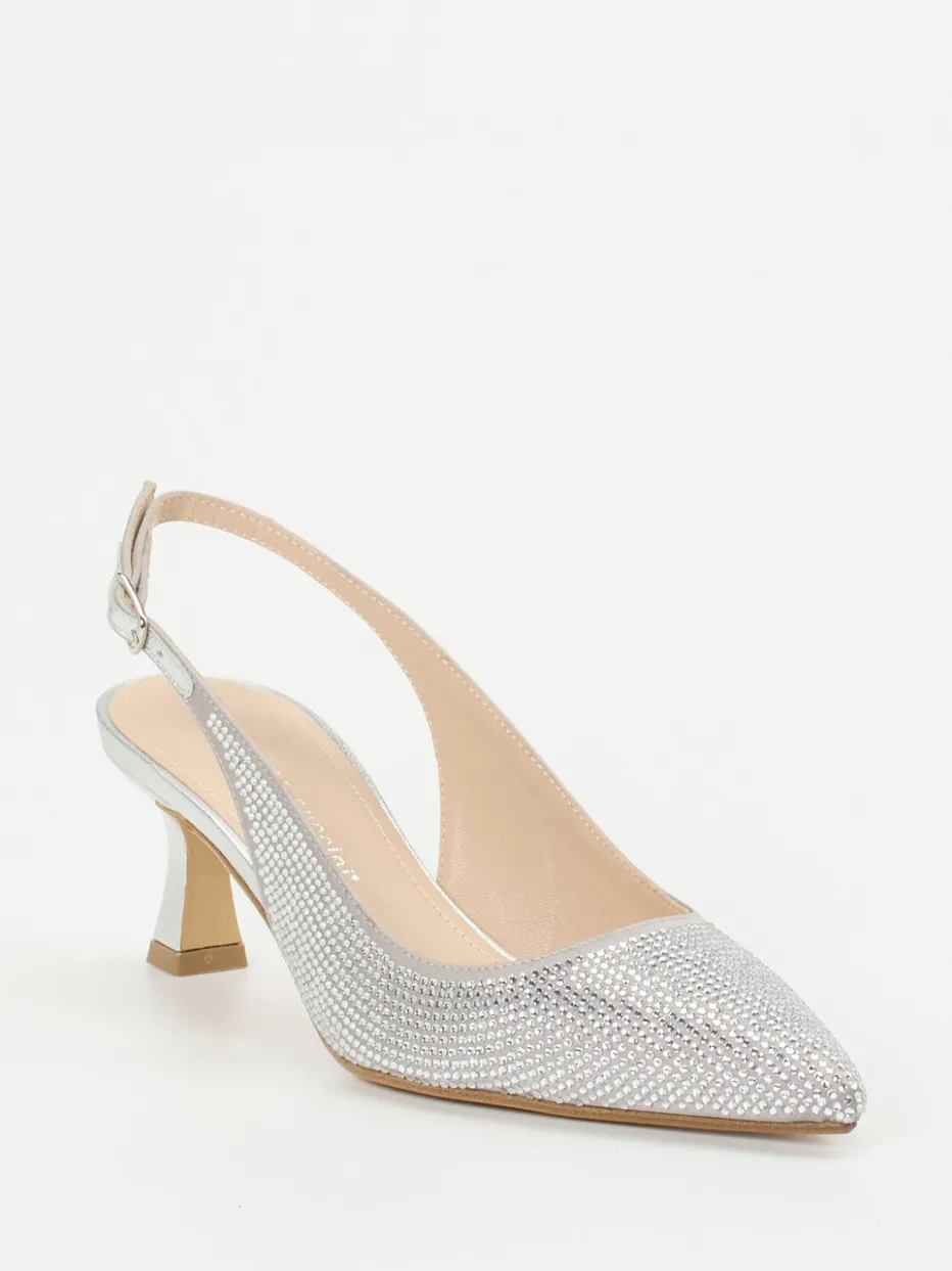 Perfekt inszeniert für besondere Anlässe.Die Marke Andrea Puccini präsentiert stilvolle Slingpumps für Damen, designt für Auftritte mit Wirkung. Ob festlicher Empfang oder glamouröses Dinner – das glänzende Metallicleder in Silber ist mit feinen Strasssteinen besetzt und bringt so ein luxuriöses Strahlen auf jeden Schritt. Der spitz zulaufende Leisten und der filigrane Kitten Heel formen eine elegante Silhouette im Vintage-inspirierten Y2K-Stil. Der verstellbare Fersenriemen mit Metallschnalle unterstreicht den femininen Look und sorgt für sicheren Halt. Besonders harmonisch wirken Metallic-Accessoires und Abendtaschen in Silberoptik. Ein stilvoller Begleiter für festliche Momente mit italienischer Handschrift.