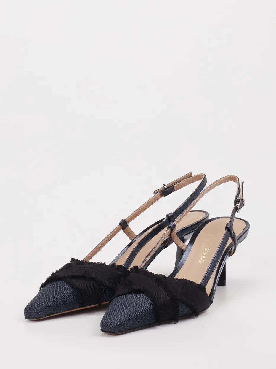 Ideal bei abendlichen Events oder festlichen Anlässen: Das strukturierte Textil in Dunkelblau, kombiniert mit glänzenden Riemen und fransigen Applikationen, verleiht dem Modell einen spannenden Texturmix. Die typisch spitze Form und der filigrane Slingback-Riemen mit Schnalle sorgen für eine elegante Silhouette. Funktional zeigt sich der stabile Kitten Heel mit angenehmer Höhe. Inspiriert von 90er-Jahre-Ästhetik und aktuellen Laufstegtrends, lässt sich der Pumps wunderbar zu Culotte oder Kleid sowie einer Clutch in Schwarz oder Blau kombinieren.