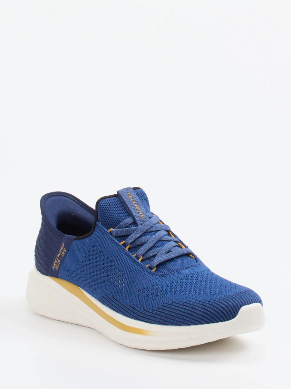 Sportliche Leichtigkeit in markantem Look.Skechers präsentiert mit diesem Slip-On Sneaker ein Herrenmodell, das Athleisure-Anspruch und Komfort virtuos vereint. Ideal für aktive Tage in Stadt und Freizeit: Das gestrickte Textil-Obermaterial in kräftigem Kobaltblau überzeugt durch hohe Atmungsaktivität, unterstützt durch eine elastische Einstiegshilfe und flexible Schnürung. Goldfarbene Akzente und eine strukturierte Ferse bringen visuelle Dynamik. Die Air-Cooled Memory Foam Innensohle sorgt für individuell abgestimmte Dämpfung – optimal auch für Einlagenträger. Funktional, trendbewusst und langlebig. Ein Herren-Sneaker, der mit progressivem Design und Skechers-typischem Tragekomfort überzeugt.