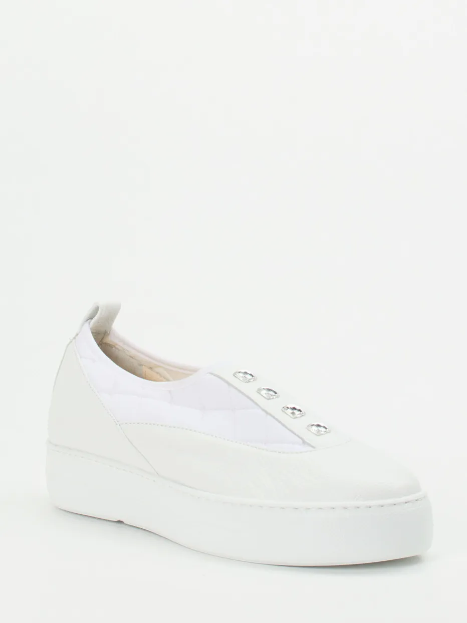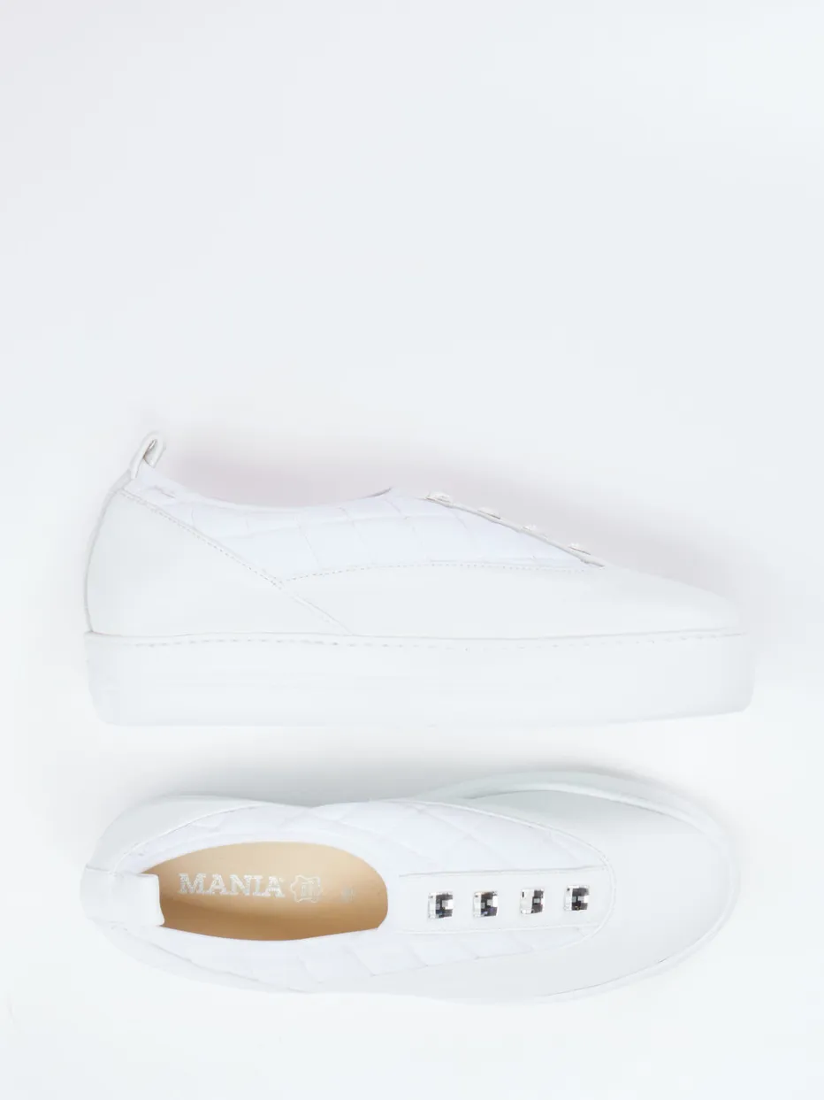 Modern zurückhaltend mit luxuriösem Akzent.Die Marke Mania präsentiert einen modisch eleganten Damen-Sneaker in Slip-On-Form. Kalbleder trifft auf gesteppte Nylon-Elemente und ergibt ein harmonisches Gesamtbild in Weiß. Die dezente Rundform mit Plateau sowie vier silberfarbene Schmucksteine prägen das stilvoll cleane Design. Komfort bietet der elastische Einstieg sowie das soft gepolsterte Fußbett. Die rutschhemmende Gummisohle und das detailverliebte Finish fügen sich nahtlos in urbane Freizeitlooks ein und greifen den Trend „Quiet Luxury“ gekonnt auf. Besonders passend zu monochromen Outfits und minimalistischen Accessoires. Mania interpretiert sommerliche Leichtigkeit komfortorientiert und stilbewusst.