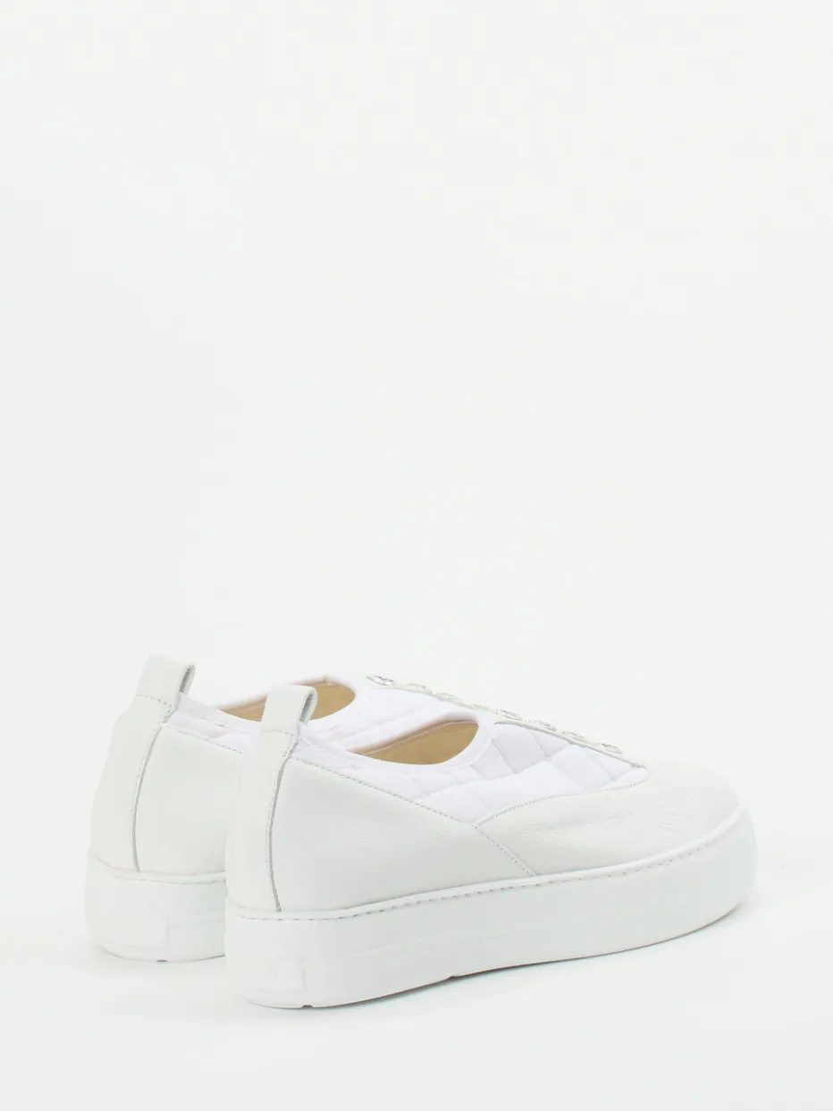 Dieser Slip-On von Mania vereint hochwertiges Kalbleder mit gesteppter Textiloptik und fein platzierten Schmucksteinen – ein minimalistisches Design mit wirkungsvollem Detail.