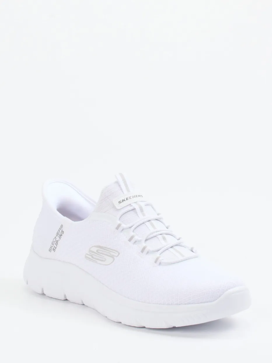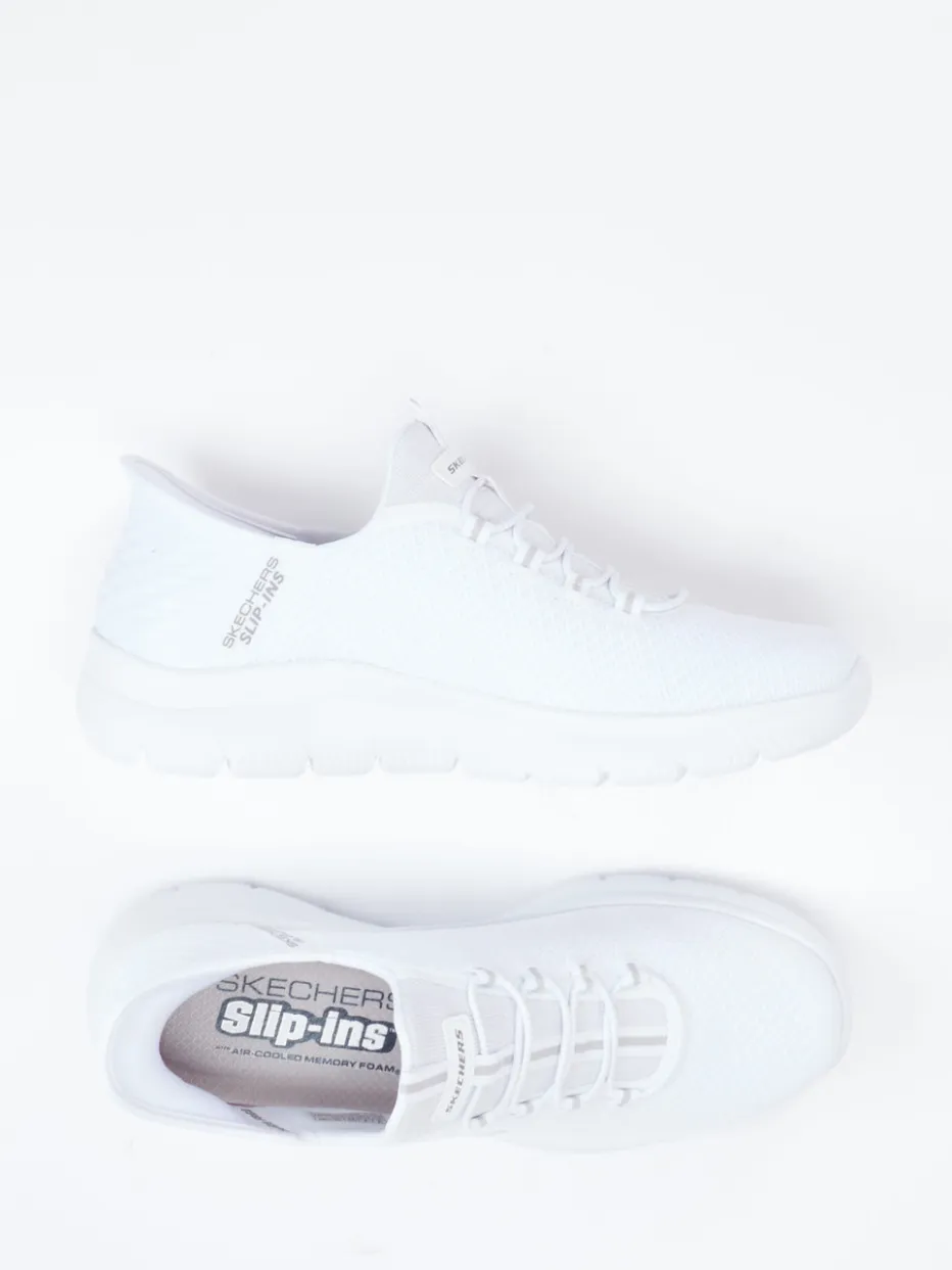 Komfort neu gedacht.Der Slip-On Sneaker von Skechers überzeugt als leichter Freizeitbegleiter mit sportlicher DNA. Ob beim Stadtbummel oder auf dem Weg zum Fitnessstudio – das weiße, strukturierte Mesh-Textil sorgt für optimale Luftzirkulation und ein frisches Tragegefühl. Die verstärkte Fersenkappe, flexible Gummisohle und das Air-Cooled Memory Foam-Fußbett bieten Komfort auf Schritt und Tritt. Dank elastischer Schnürung und Slip-Ins-Technologie ist auch das Anziehen minimalistisch durchdacht. Die komplett weiße Optik trifft den All-White-Trend und lässt sich vielseitig kombinieren. Innovative Materialien treffen hier auf maximalen Gehkomfort – typisch Skechers.