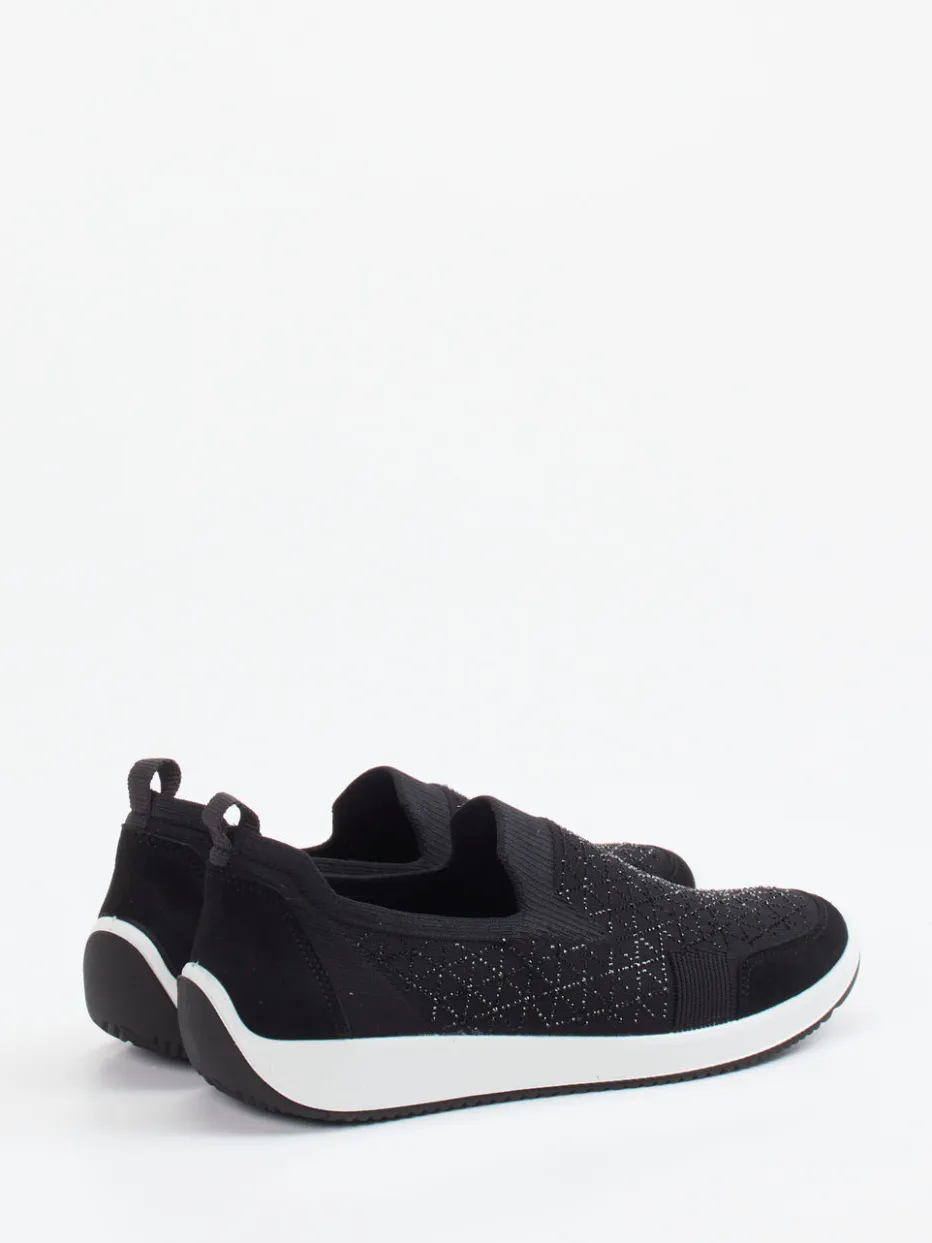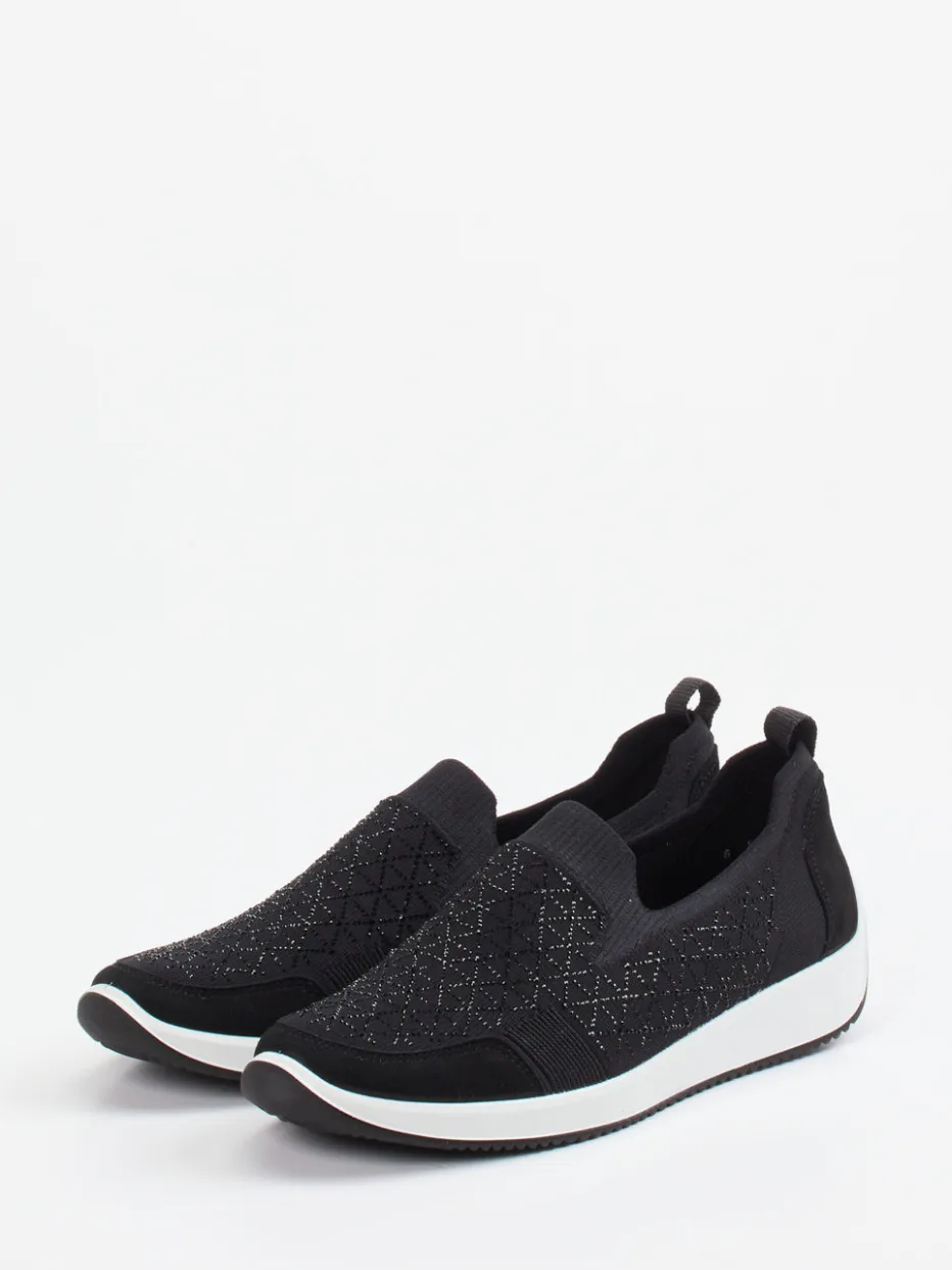 Ara präsentiert einen modernen Slip-On Sneaker für Damen in stilvollem Schwarz mit silberfarbenen Akzenten.