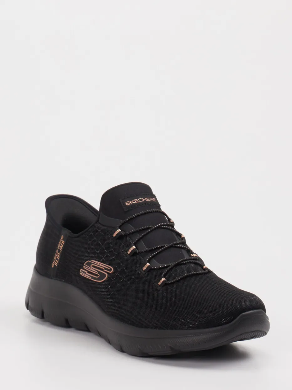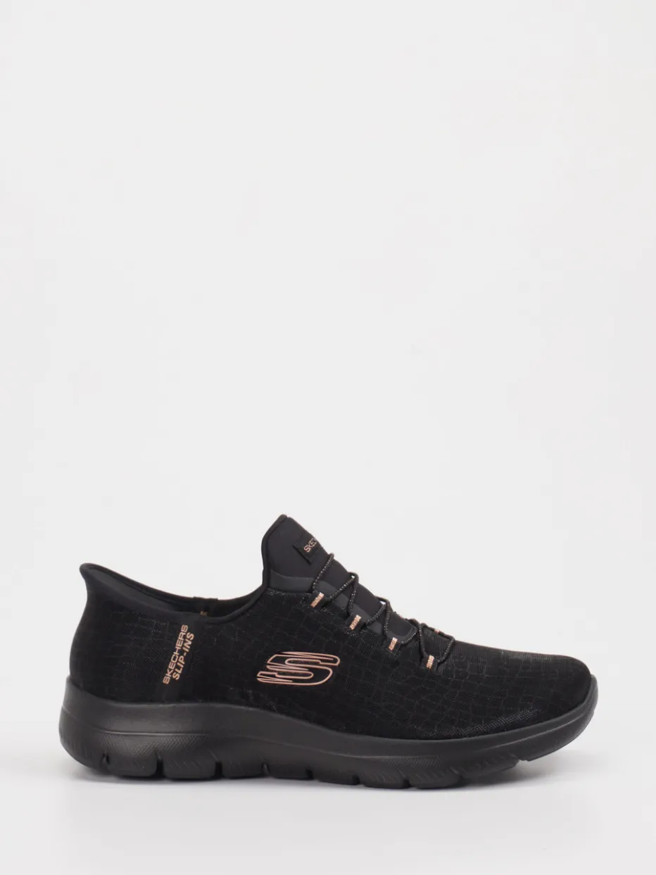 Komfort trifft auf dezente Struktur. Skechers präsentiert mit diesem Damen-Sneaker ein Slip-On-Modell, das durch entspannten Minimalismus überzeugt. Das pflegeleichte Textil-Obermaterial zeigt sich in mattem Schwarz mit feiner Krokoprägung, ergänzt durch kupferfarbene Logo-Details. Die flache, niedrig geschnittene Silhouette wird durch ein elastisches Schnürsystem und einen gepolsterten Einstieg ergänzt. Innen sorgt eine Air-Cooled Memory Foam-Innensohle für besonders angenehmes Laufgefühl – auch auf längeren Wegen. Ideal für Casual-Styles in Freizeit, Alltag oder entspannte Homewear-Outfits. Die profilierte Gummisohle rundet den funktionalen Look sportlich ab. Skechers verbindet modische Bequemlichkeit mit modernem Designanspruch.