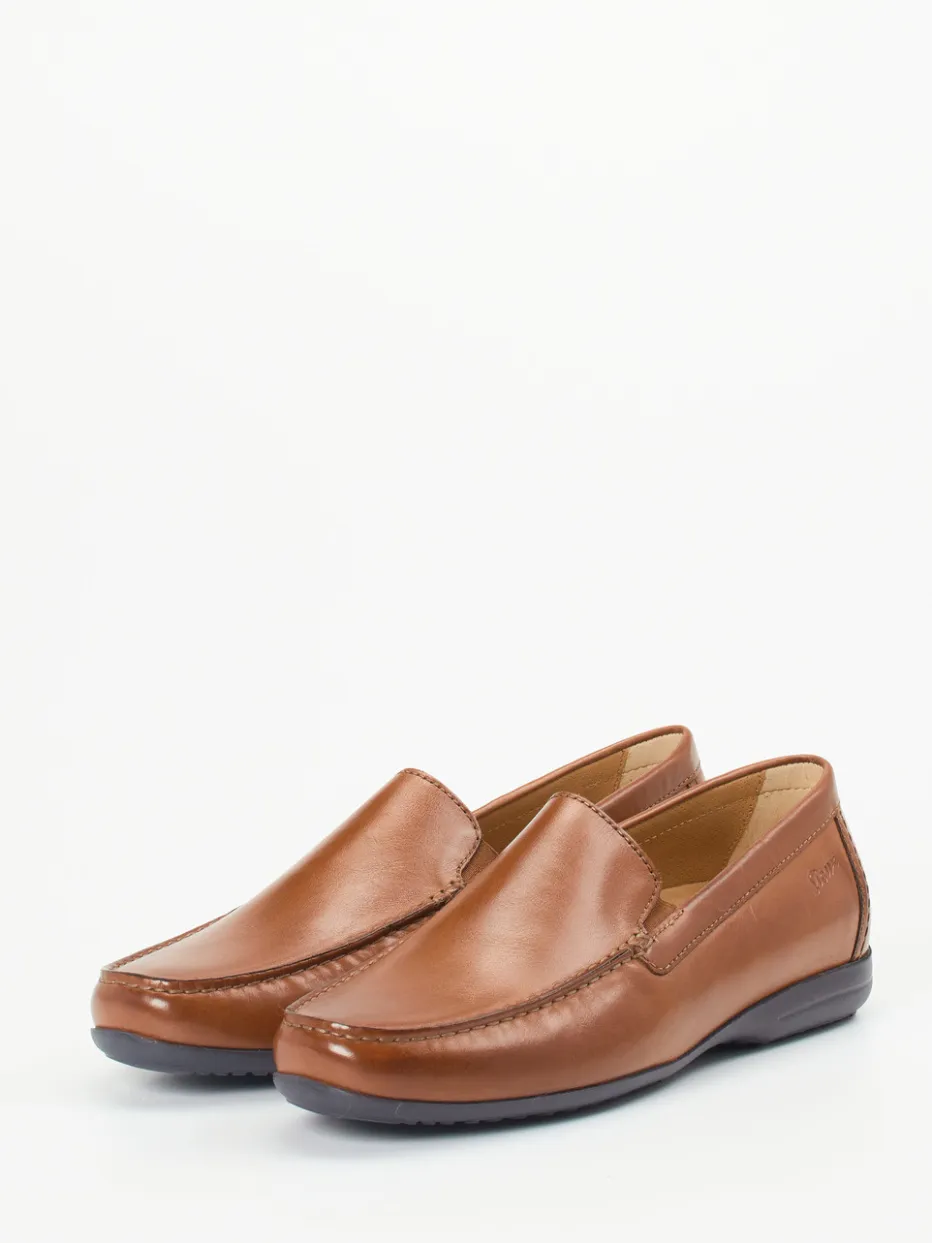 Der cognacbraune Herren-Slipper kombiniert hochwertiges Kalbleder mit komfortabler Weite H und einer flexiblen Gummisohle – ideal für stilvolle Alltagssituationen.